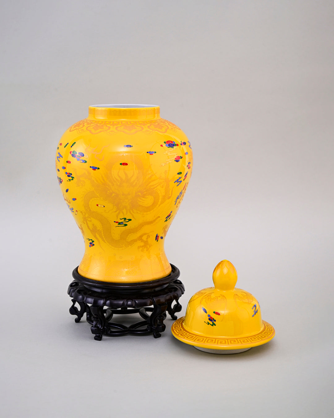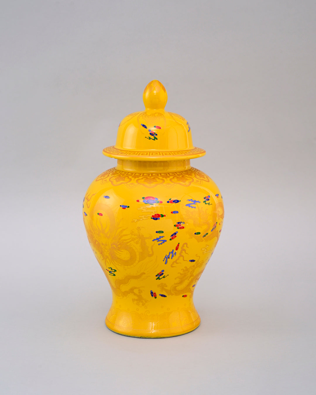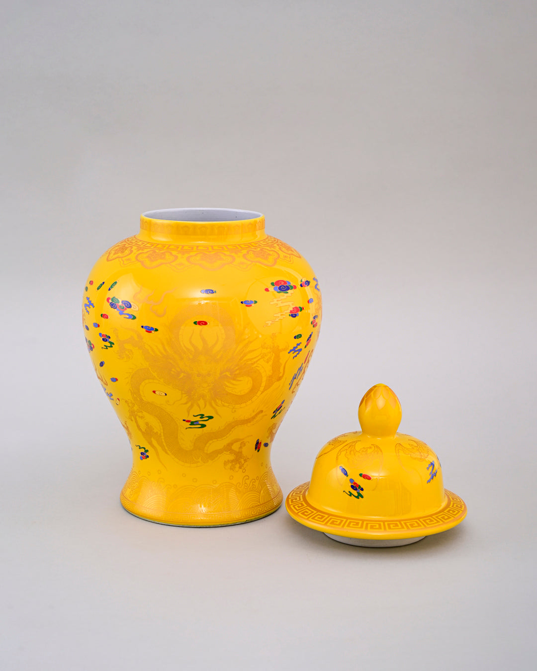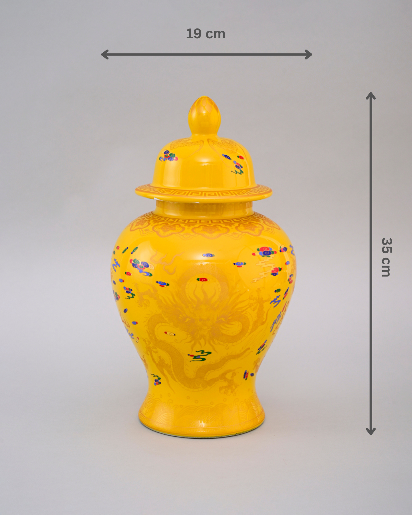 The Imperial Golden Dragon Temple Jar is a masterpiece of traditional porcelain artistry, featuring majestic golden dragons on a rich yellow base. Accented with colorful cloud motifs and intricate detailing, this temple jar symbolizes strength, prosperity, and good fortune.