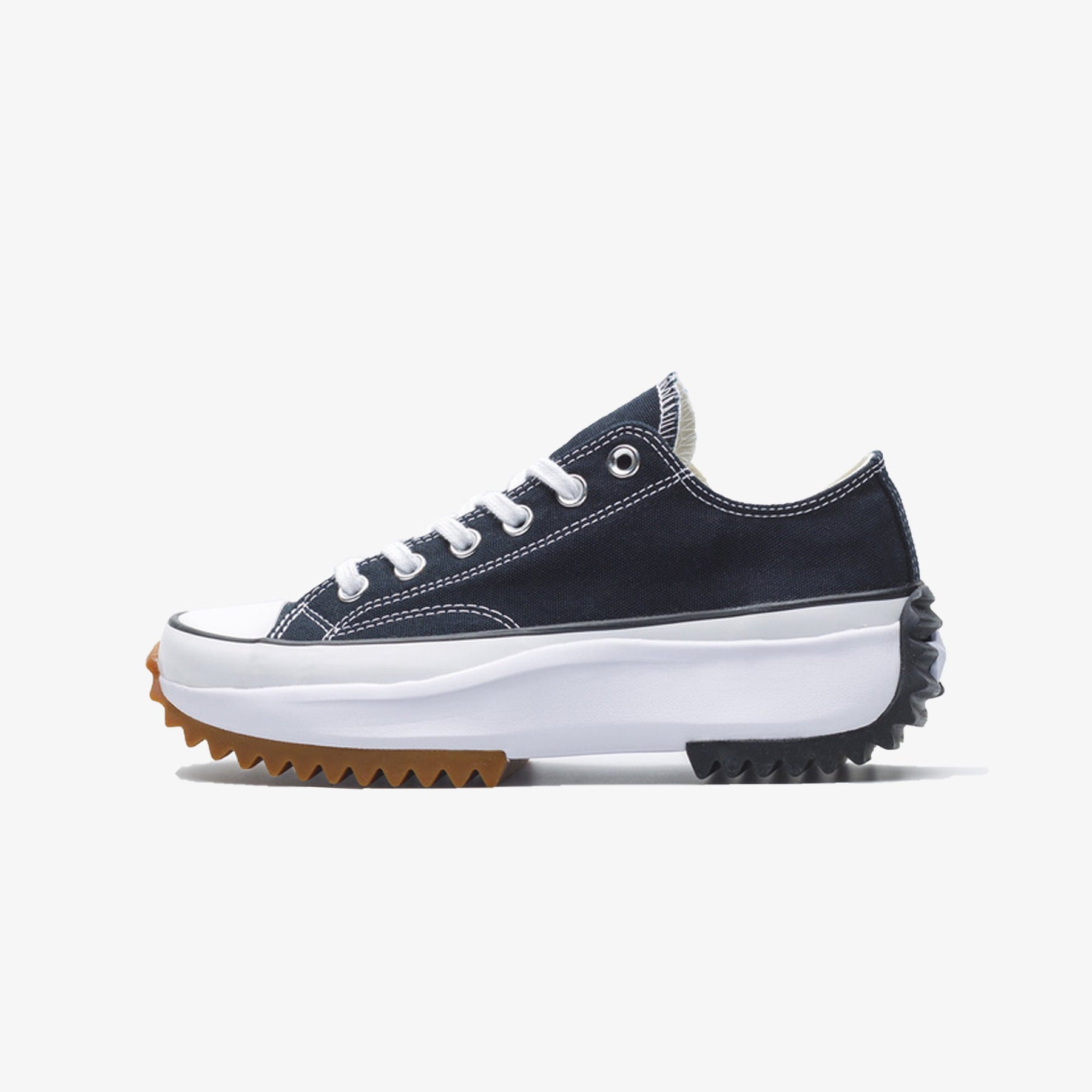 Available in a low top for the first time, the Run Star Hike's chunky platform and jagged rubber sole put an unexpected twist on your everyday Chucks. Details like an organic canvas build, rubber toe cap and Chuck Taylor ankle patch stay true to the original, while a molded platform, two-tone outsole and rounded heel give off futuristic vibes. Winged tongue stitching for reinforcement.