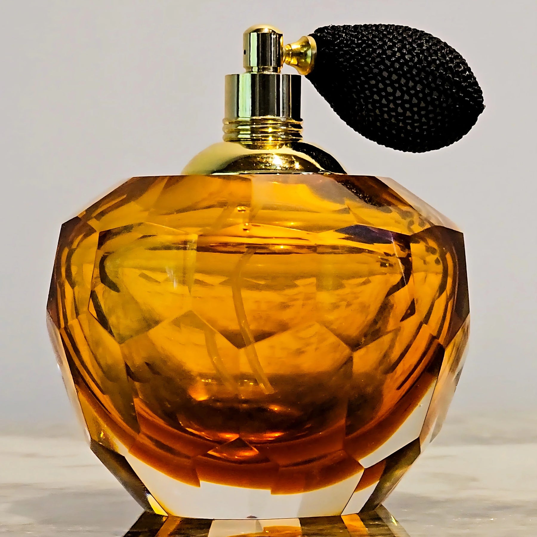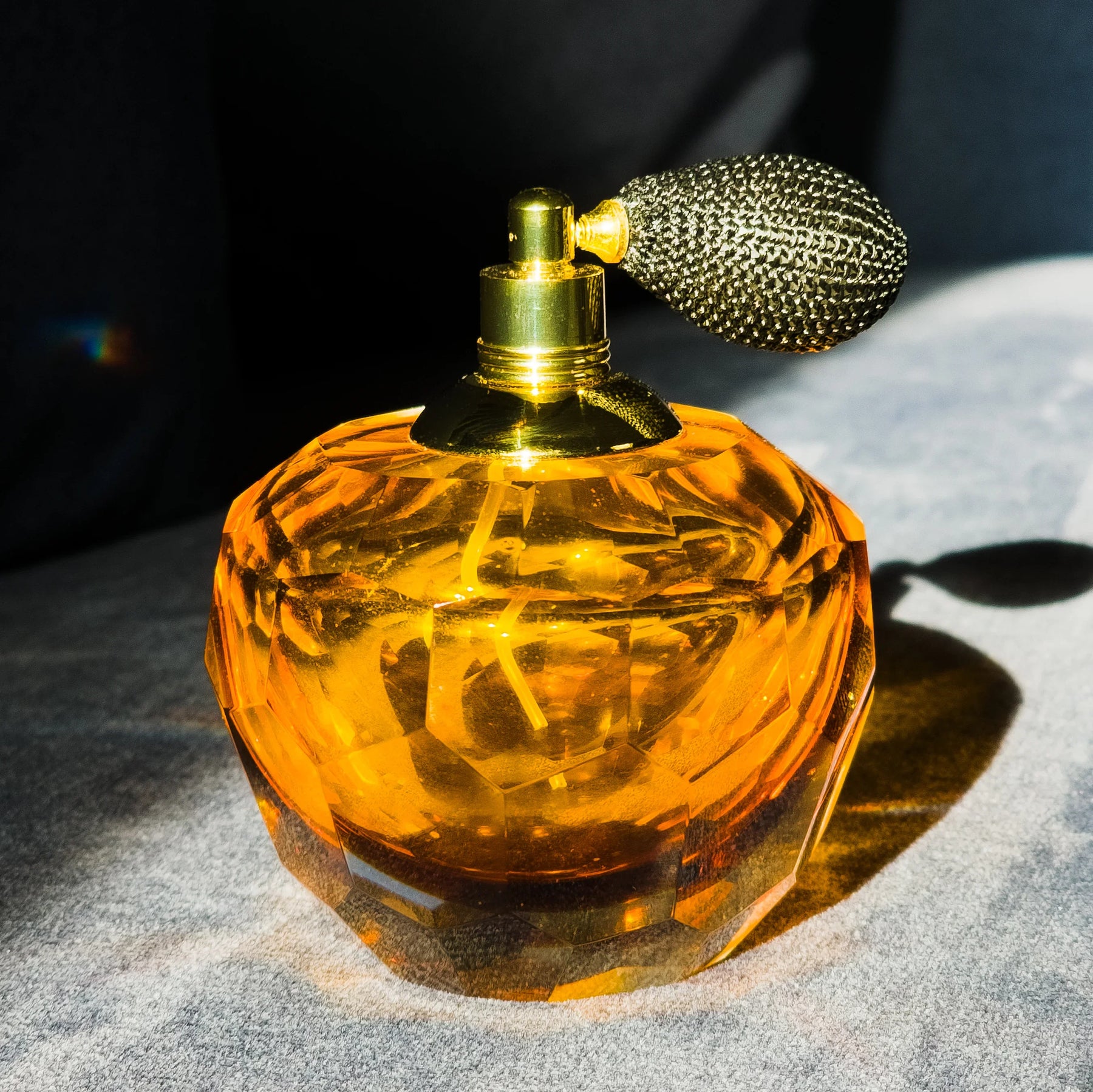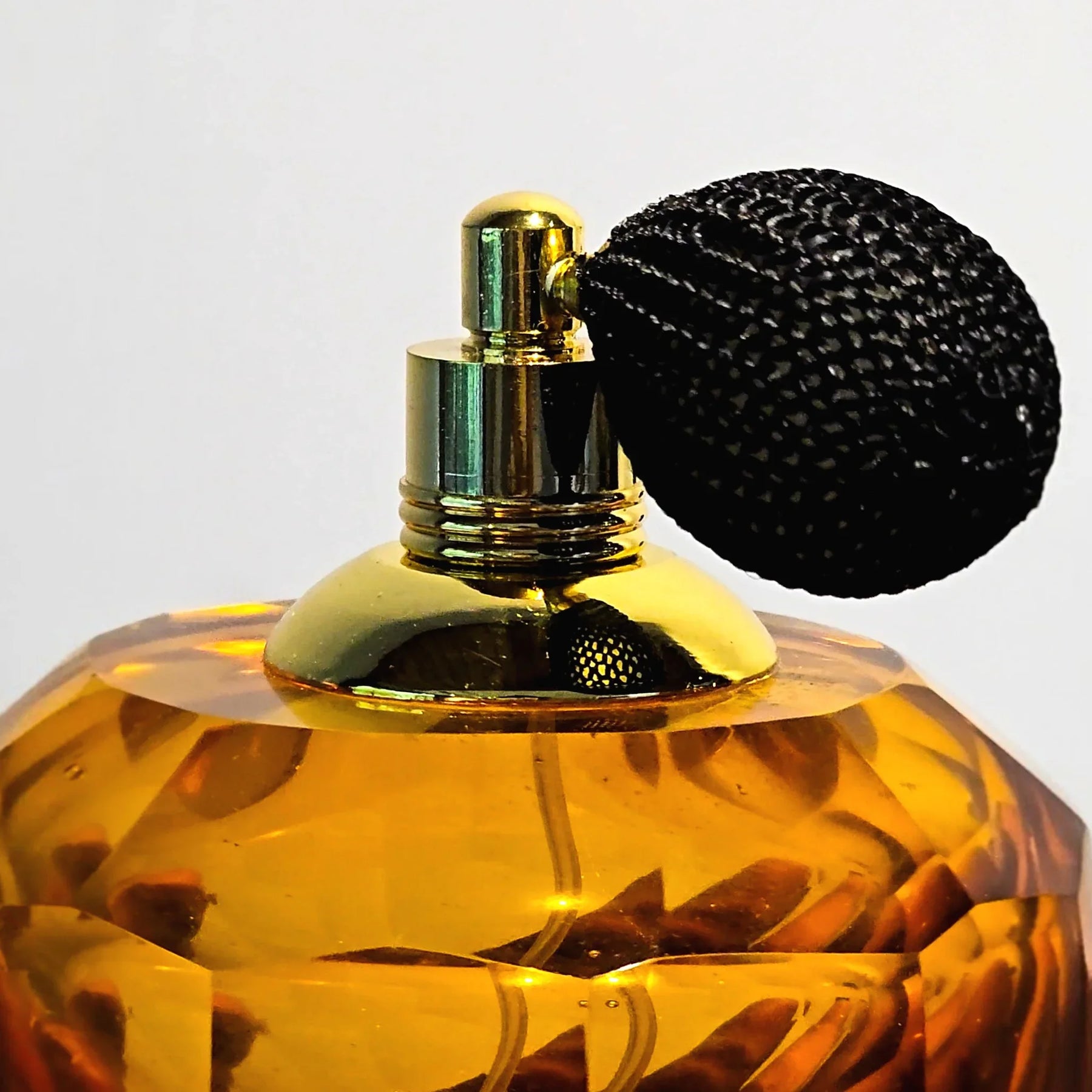 This Amber Crystal Perfume Sprayer combines vintage charm with luxurious design. Crafted from faceted amber-toned crystal and finished with a gold sprayer and textured bulb, it brings elegance to your vanity while keeping your favorite fragrance stylishly stored.