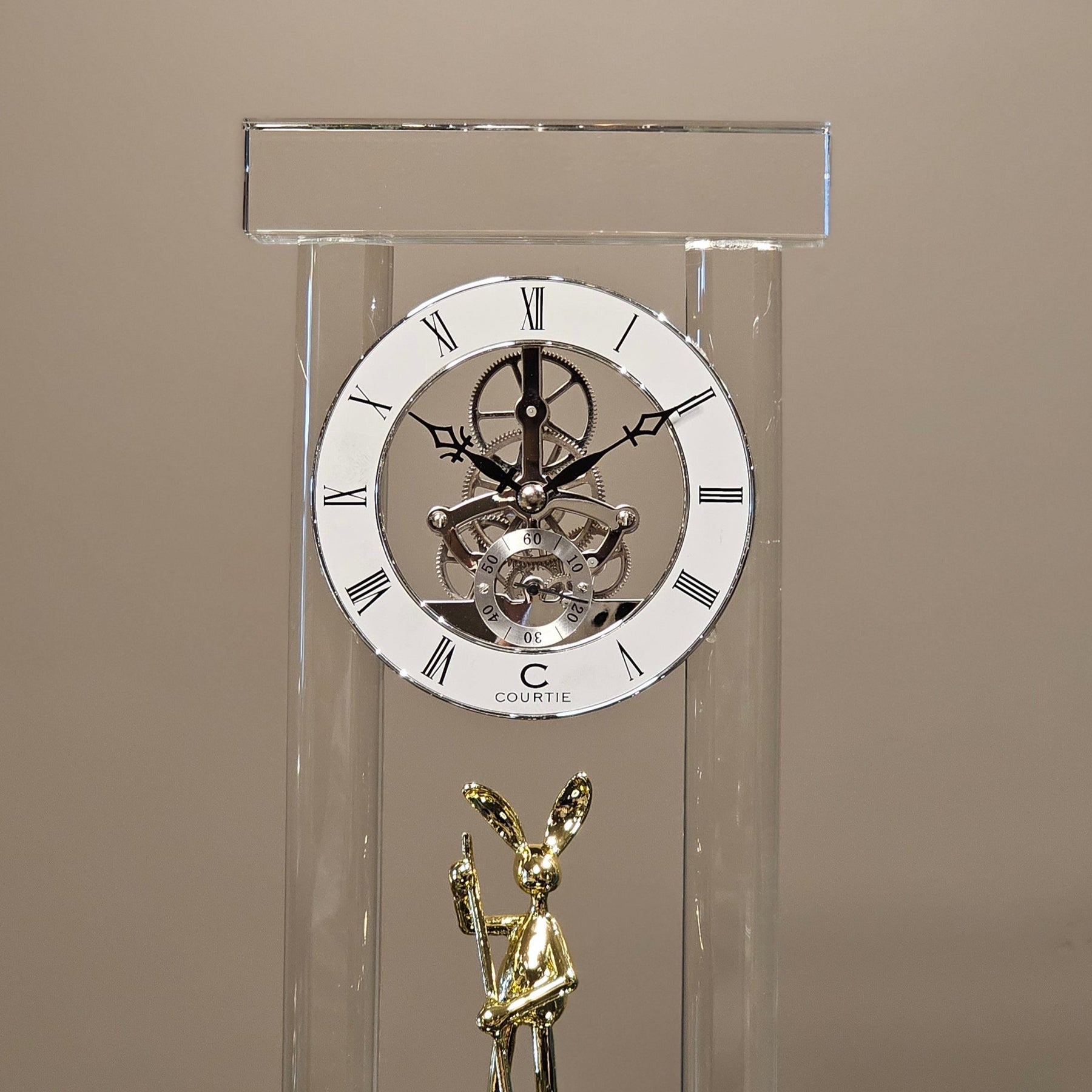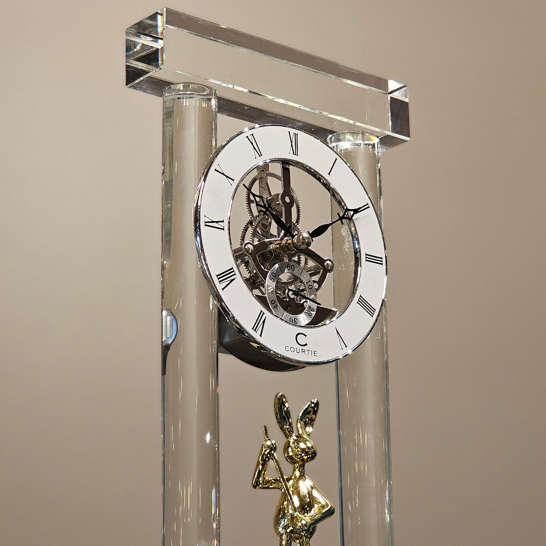 Bring poetic elegance to your décor with The Rowing Hare Crystal Timepiece — a sophisticated table clock encased between twin glass pillars, resting on a matching crystal base. At its heart lies a pristine white dial with a classic mechanical aesthetic, exuding timeless charm.