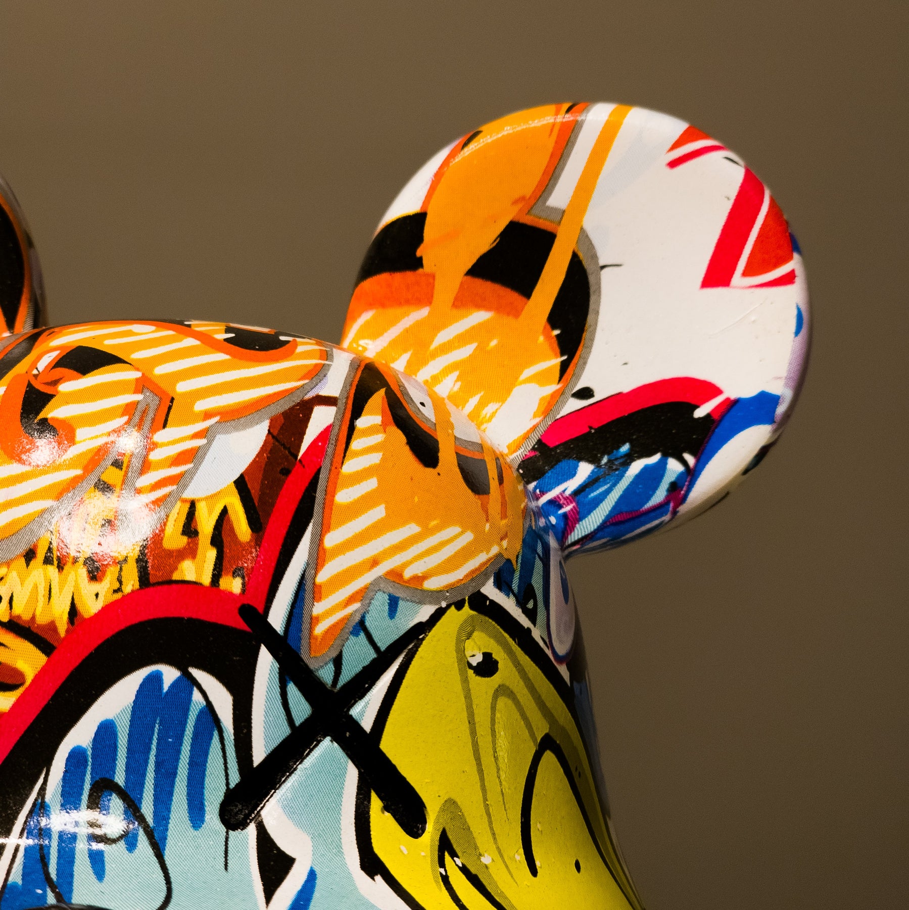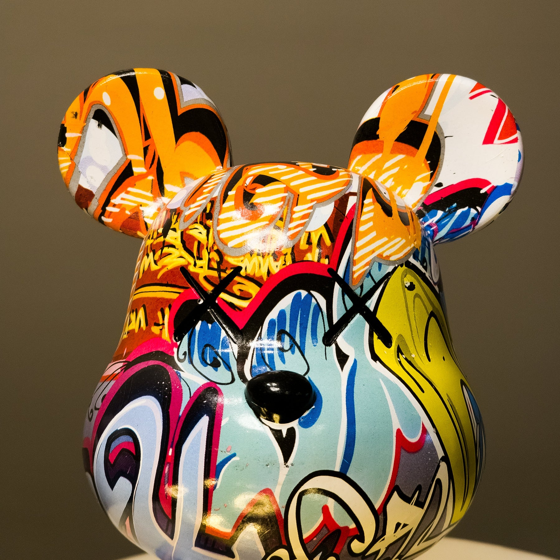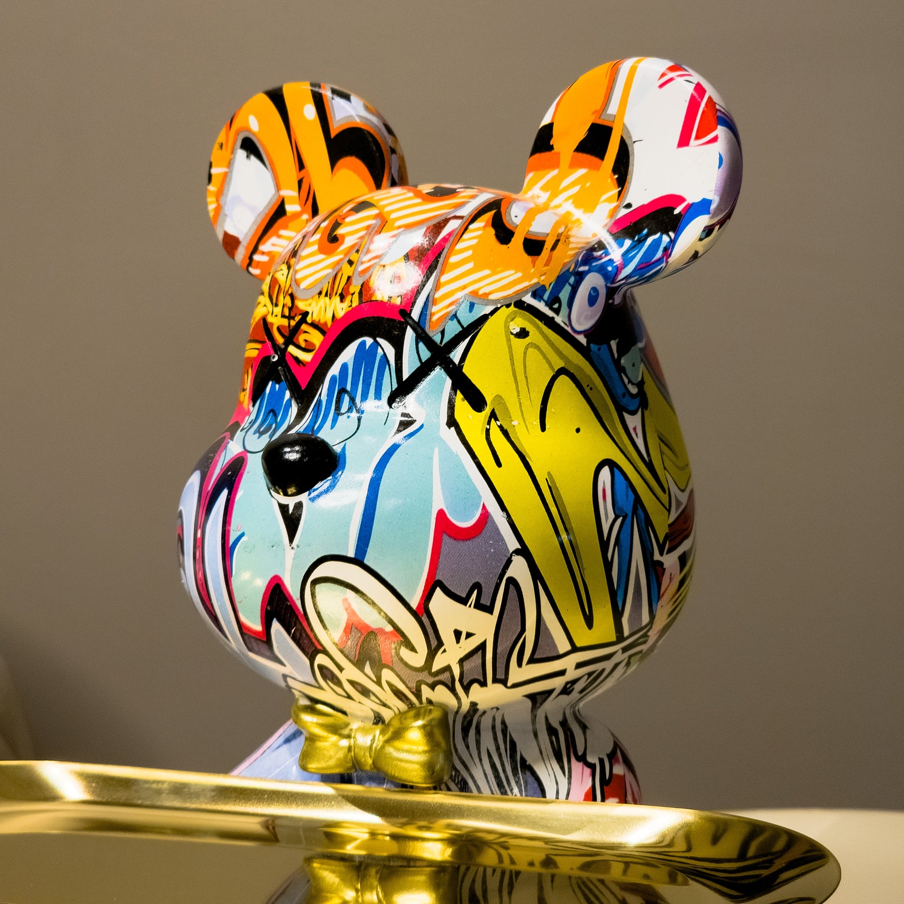Meet the UrbanPop Bear Tray Accent — a striking fusion of utility and street-style charm. This seated bear, splashed with a vibrant graffiti-inspired pattern, holds a sleek golden tray in its lap, making it a stylish solution for organizing your daily drop-offs like keys, wallets, sunglasses, or jewelry.