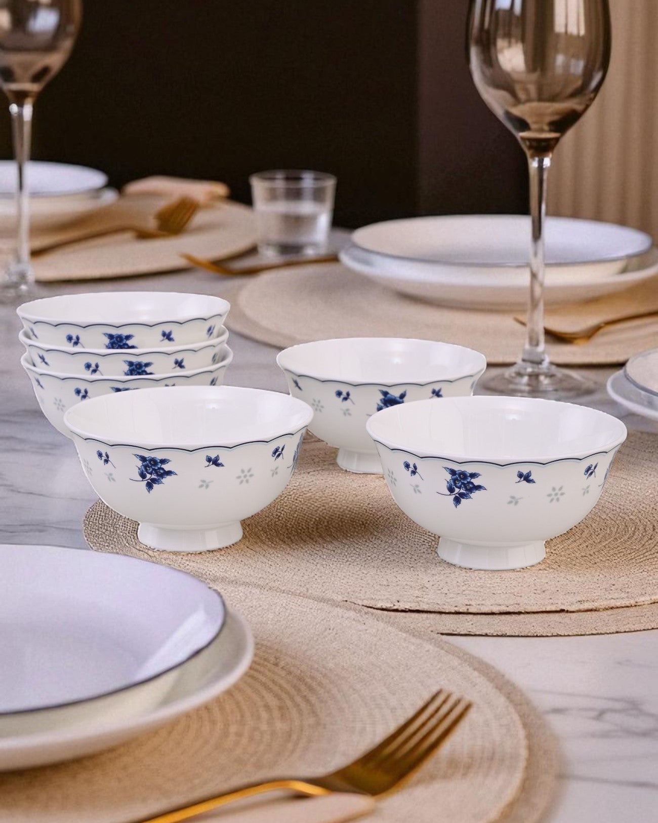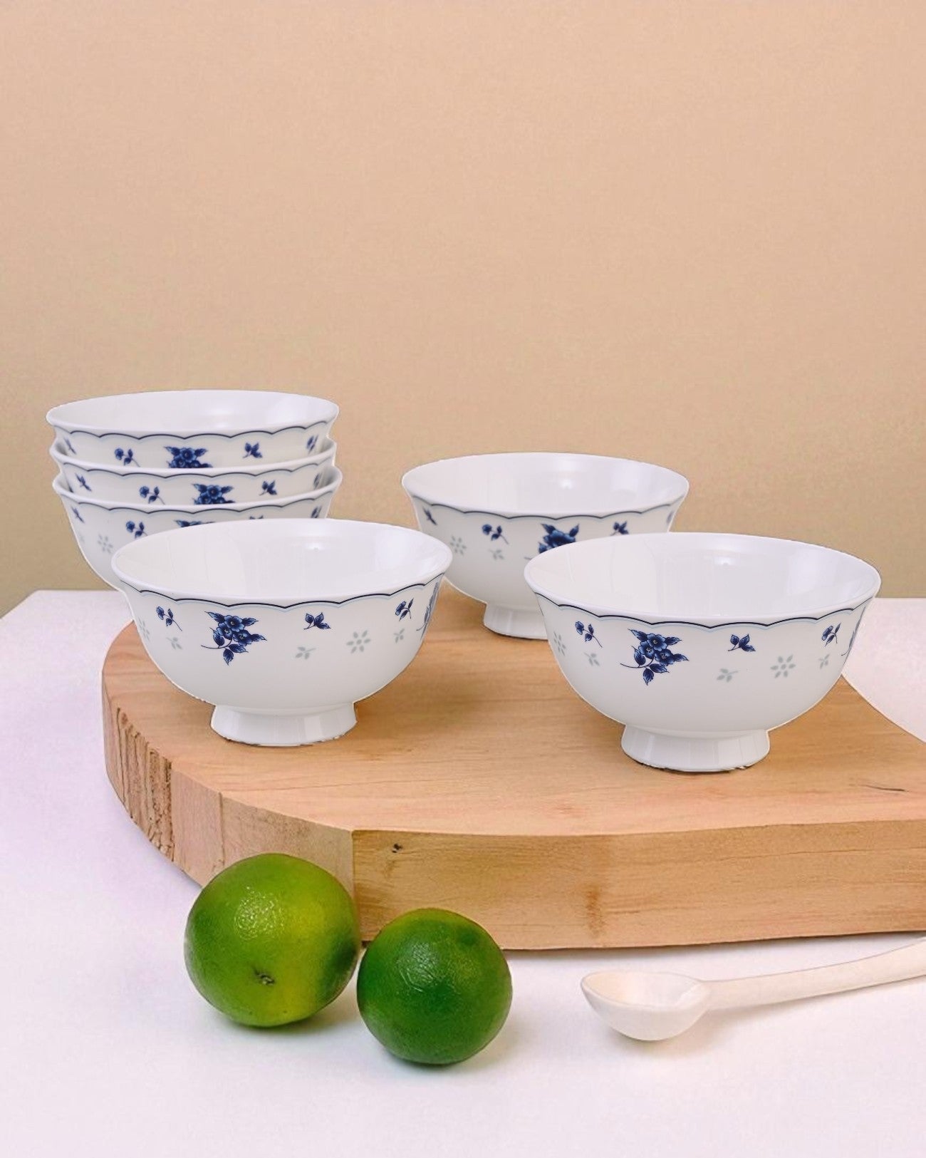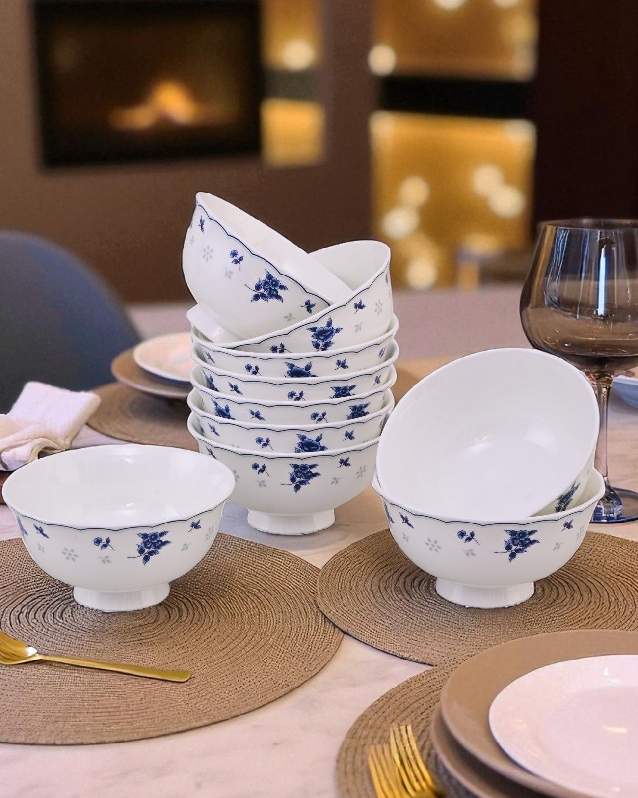 This blue petal elegance ceramic bowl features a delicate floral pattern with charming blue flowers and butterfly motifs, adding a graceful touch to your dining experience. Crafted from premium-quality ceramic, these bowl are perfect for serving snacks, desserts, soups, and curries.