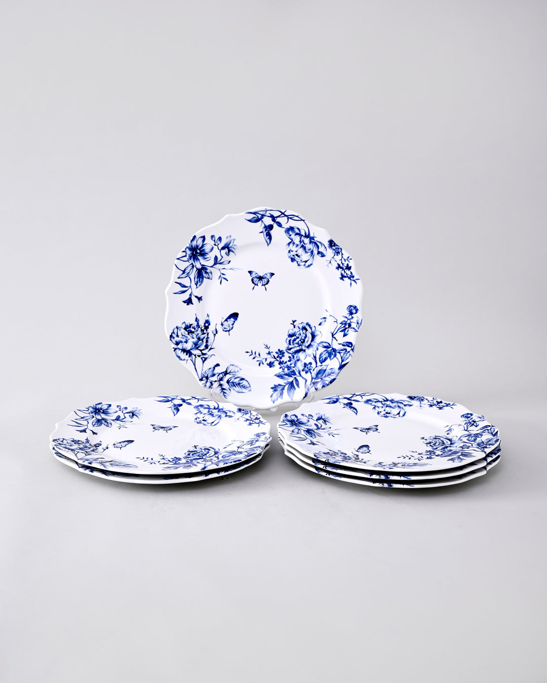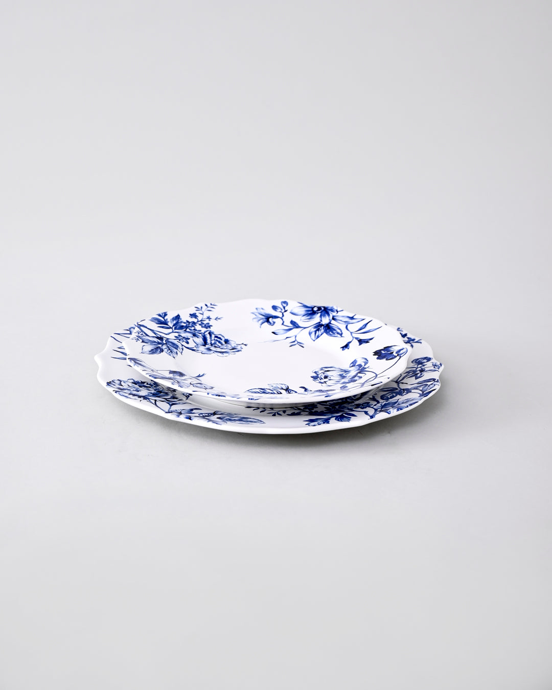 This dinner plate features a timeless white base adorned with intricate cobalt-blue floral motifs, reminiscent of classic porcelain artistry. The delicate flower patterns bring an air of vintage charm, while the scalloped edges add refinement and character to the piece.