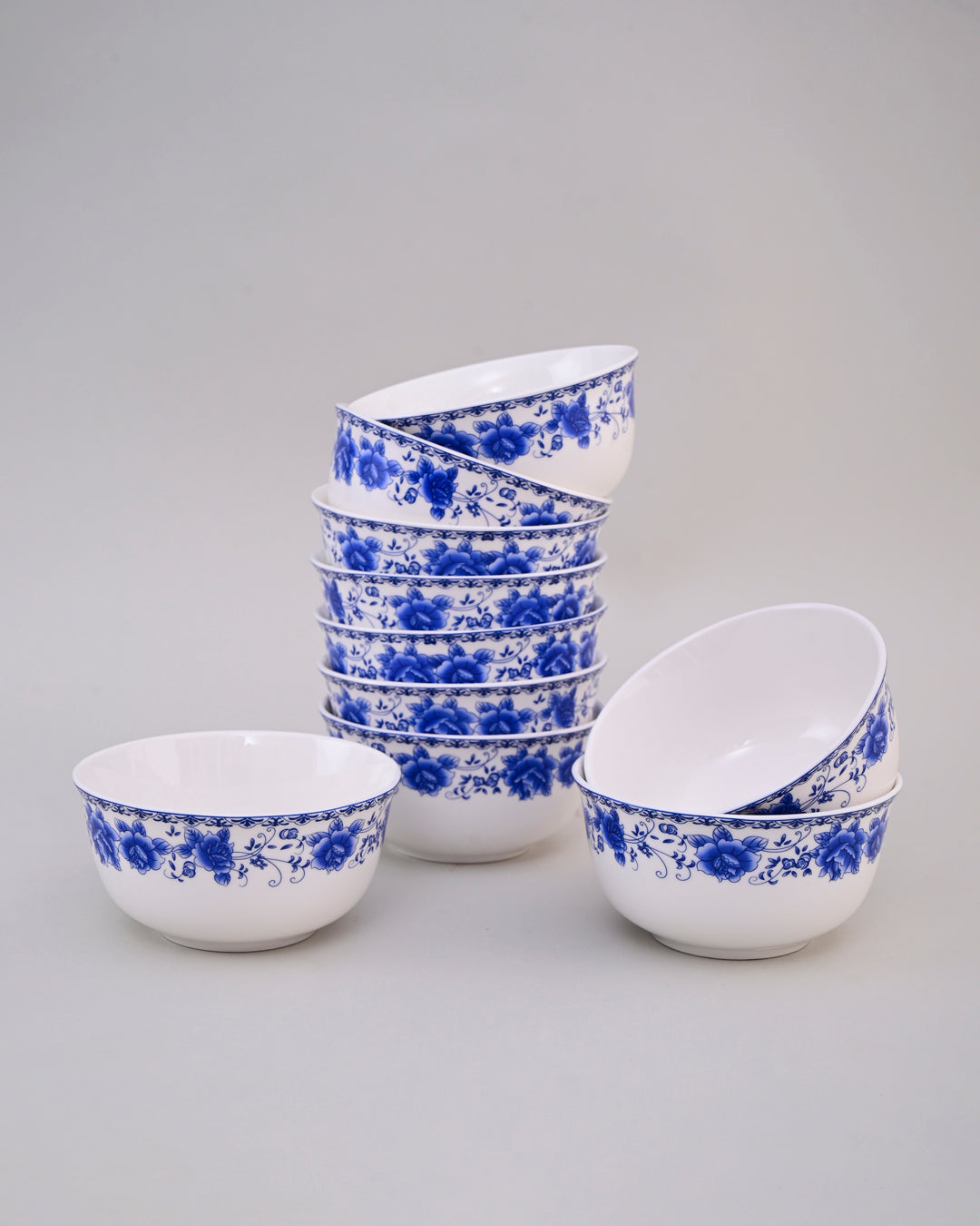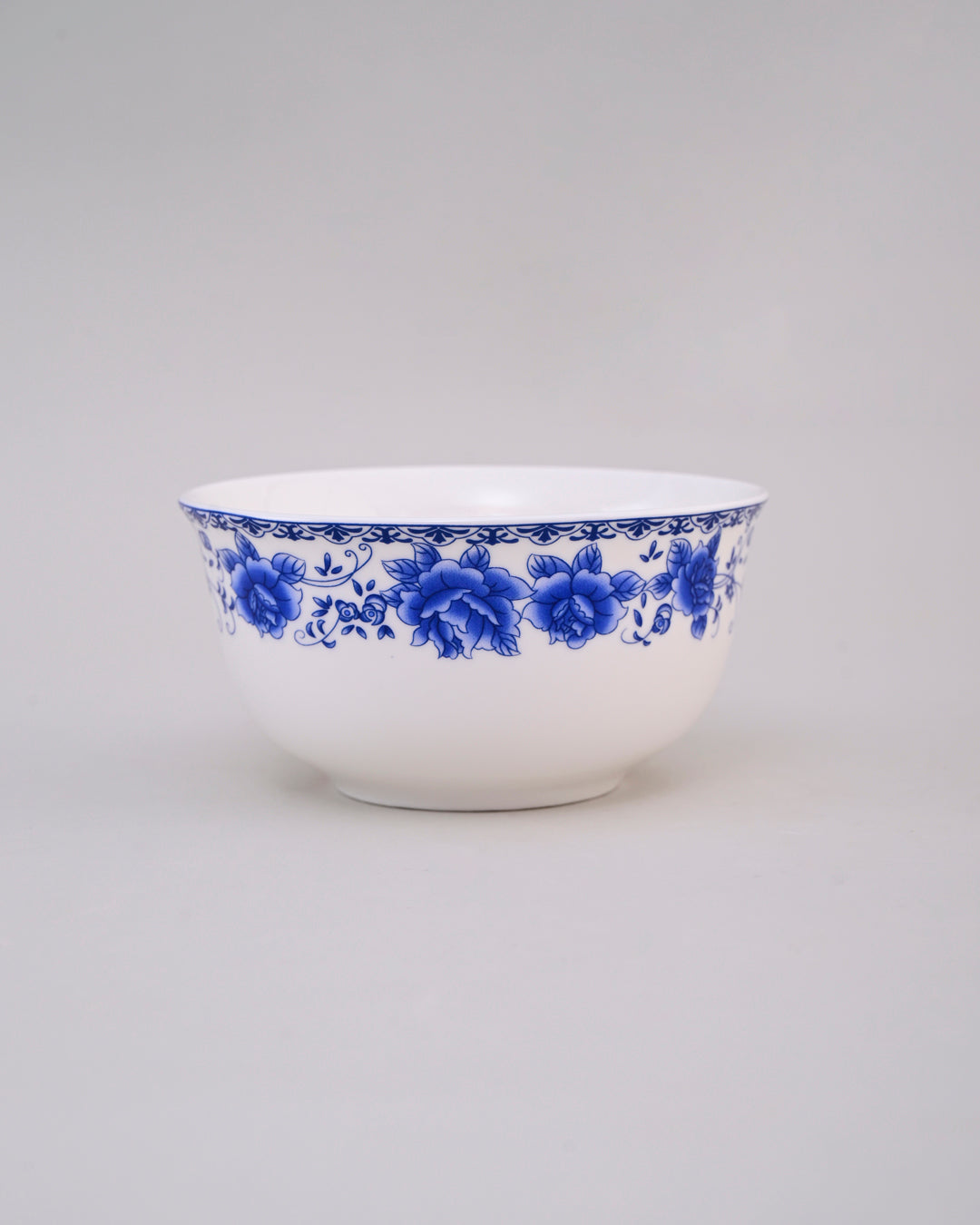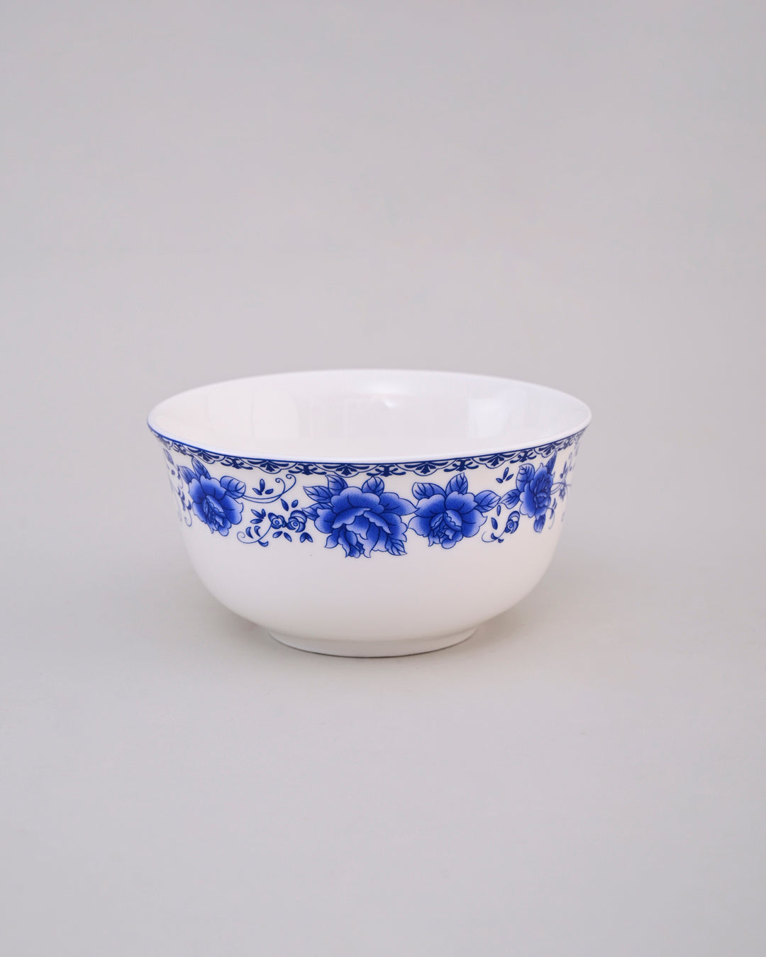 This porcelain bowl showcases a charming design with vivid blue roses encircling the rim, creating an elegant contrast against the crisp white base. Its floral detailing adds a touch of sophistication and timeless beauty. Perfect for serving meals, snacks, or as a decorative piece, this bowl brings classic artistry and elegance to any dining setting.