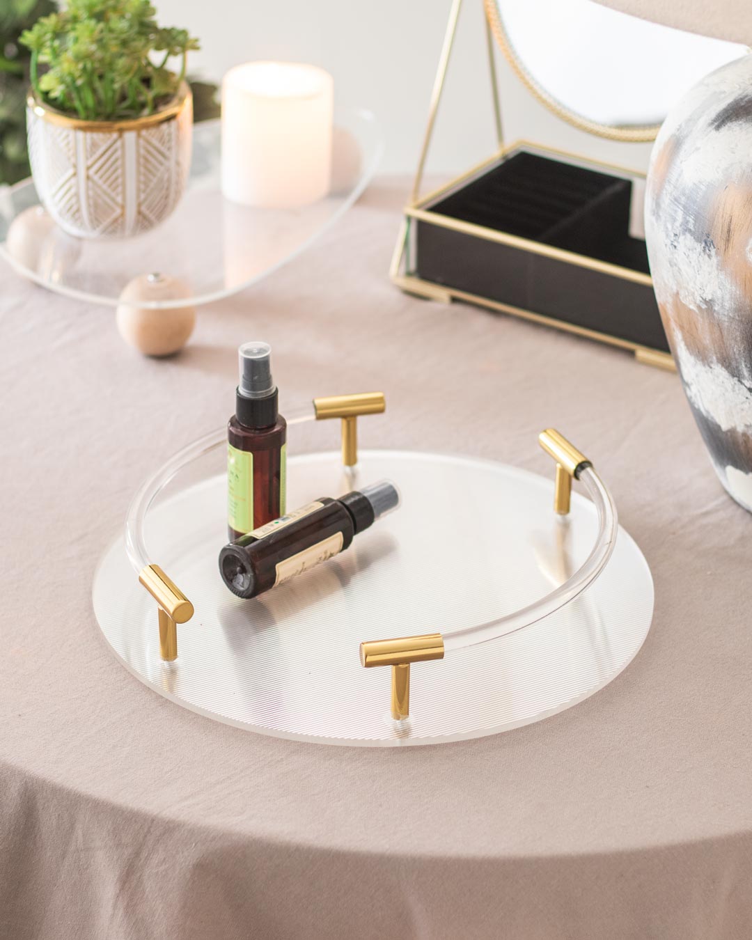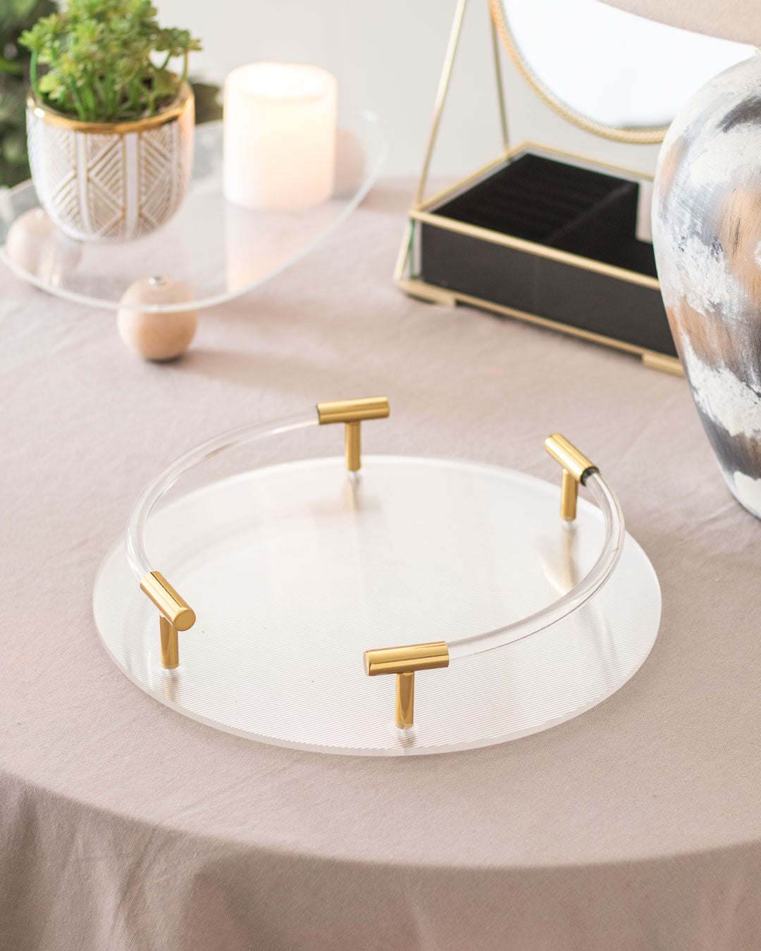 The overall design follows the classic fully transparent rectangular shape and the simple and stylish golden handle design, which is perfectly integrated with your home, making your home look more tidy and attractive, and it will also attract friends and family love. Perfect for makeup table tray, nightstand tray, coffee, and tea snack serving tray, even use for bathroom decoration tray. Keep your home organized. Leak-proof Design With fully sealed corners and an external curved handle design, you can easily and safely move the tray from the kitchen to the living room.
