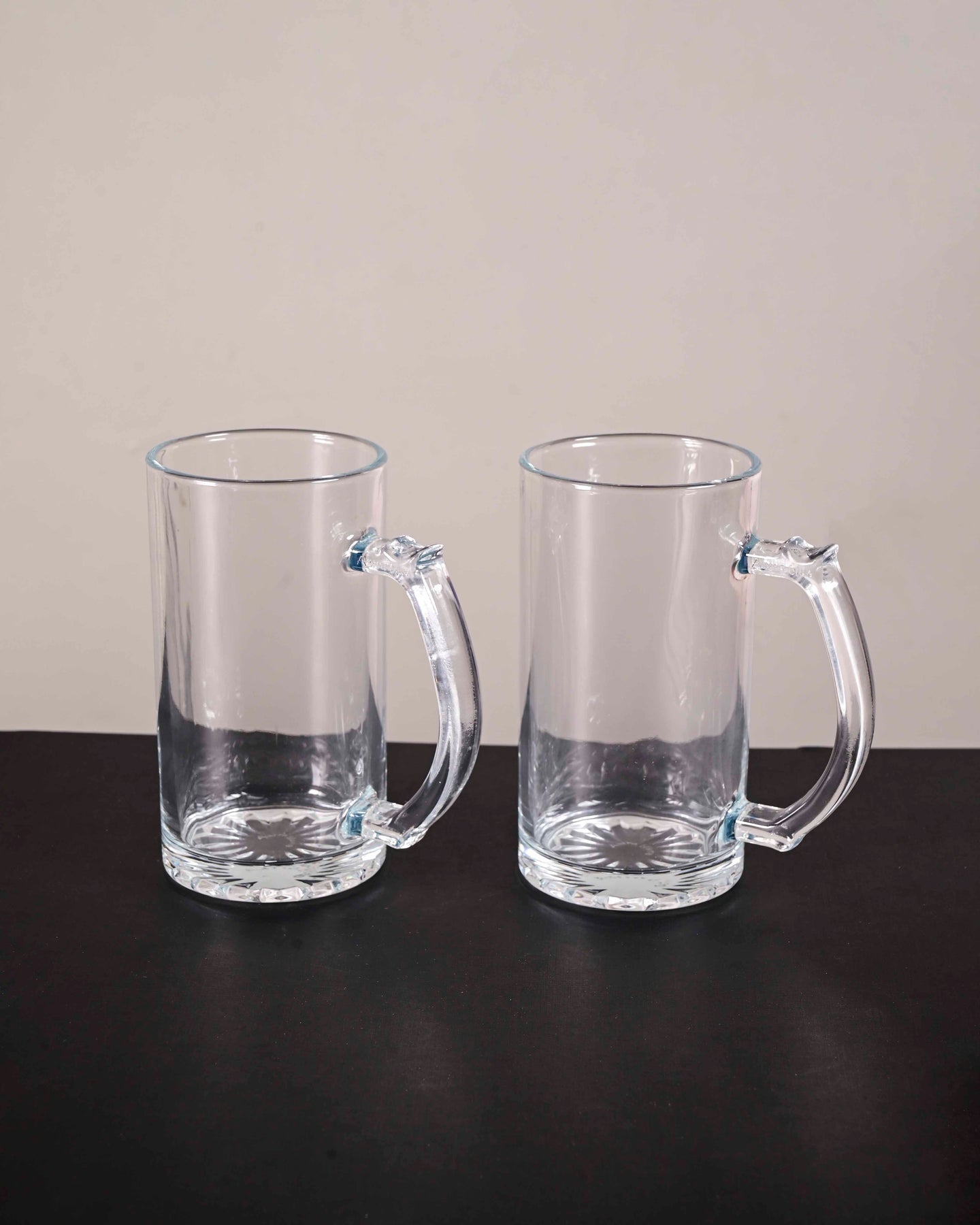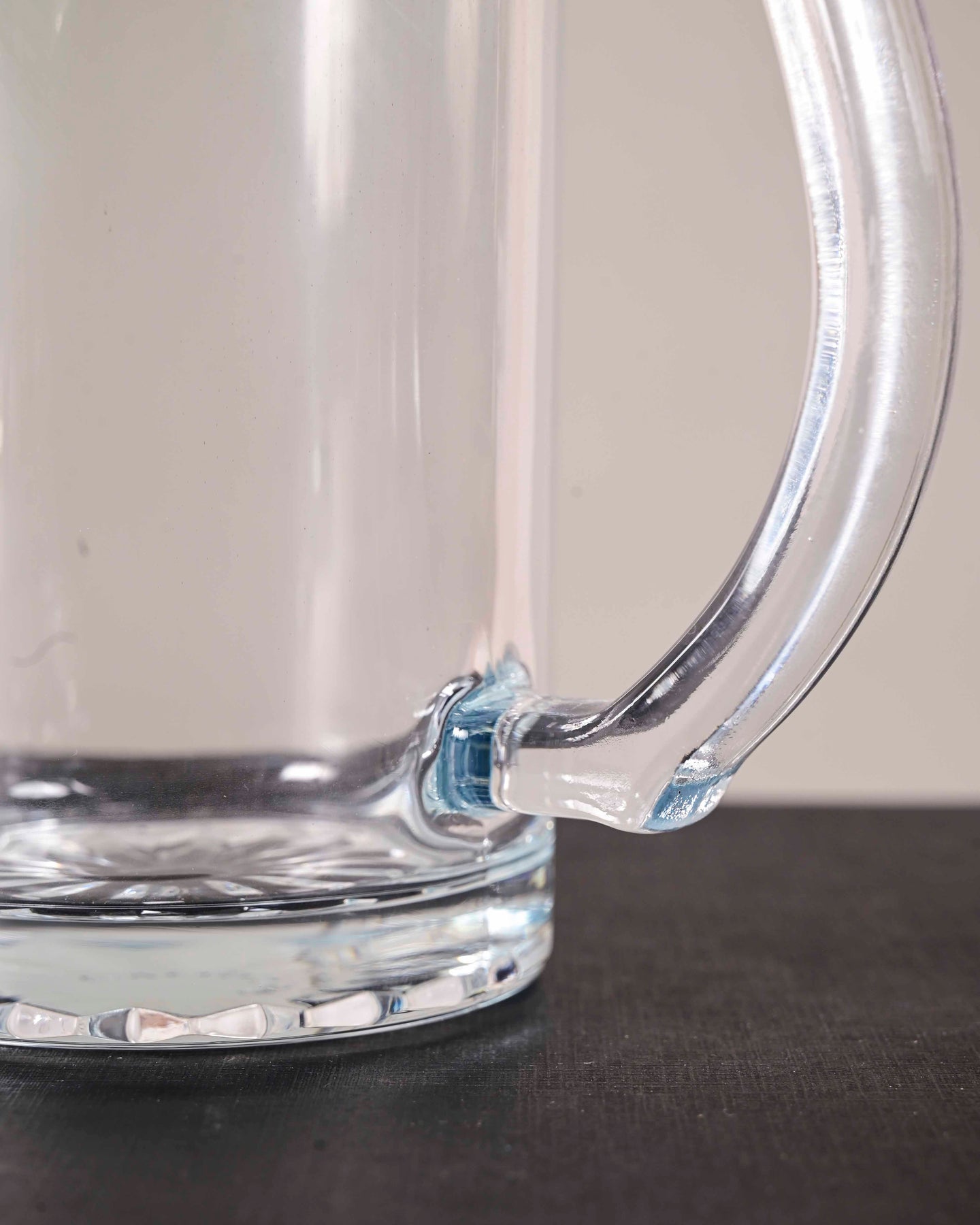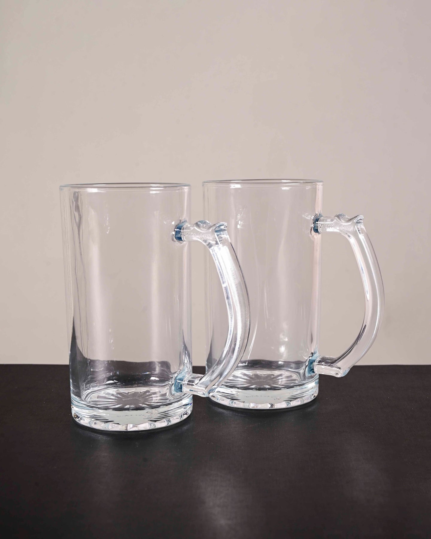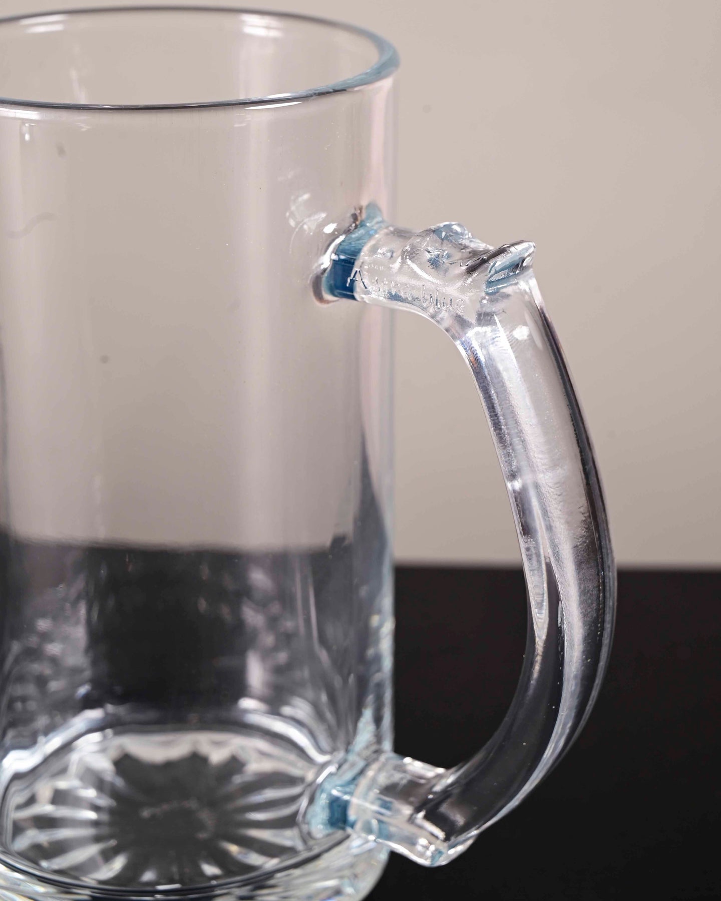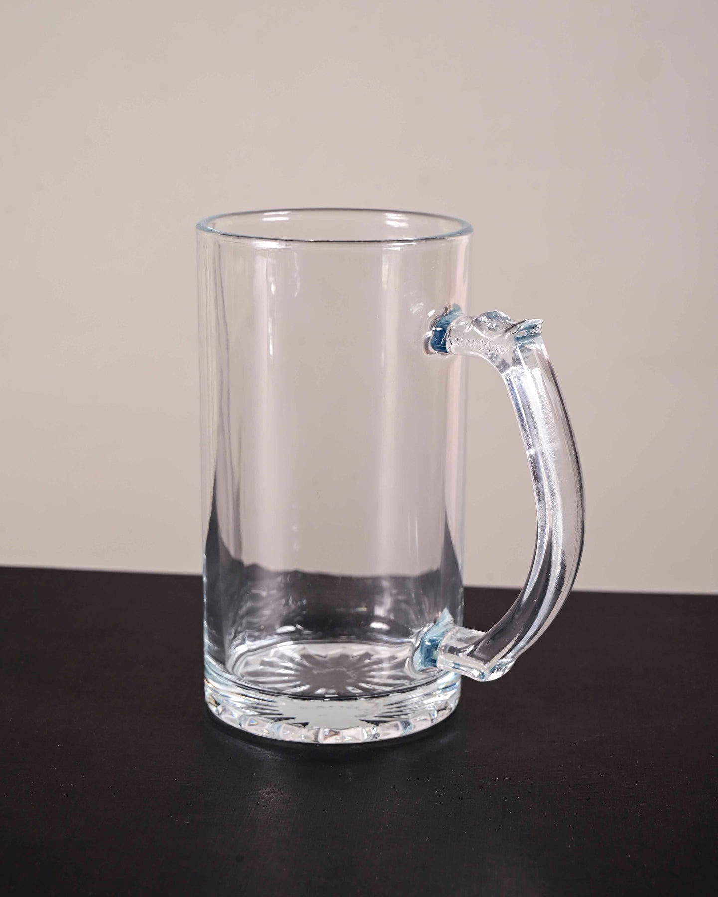 This glass beer mug features a sturdy handle and a wide, cylindrical shape, perfect for a comfortable grip and easy sipping. Its clear, thick glass showcases the beer's color and carbonation beautifully, enhancing the overall drinking experience. With a generous capacity, it's ideal for enjoying a full pint of your favorite brew, whether at home or in a bar.