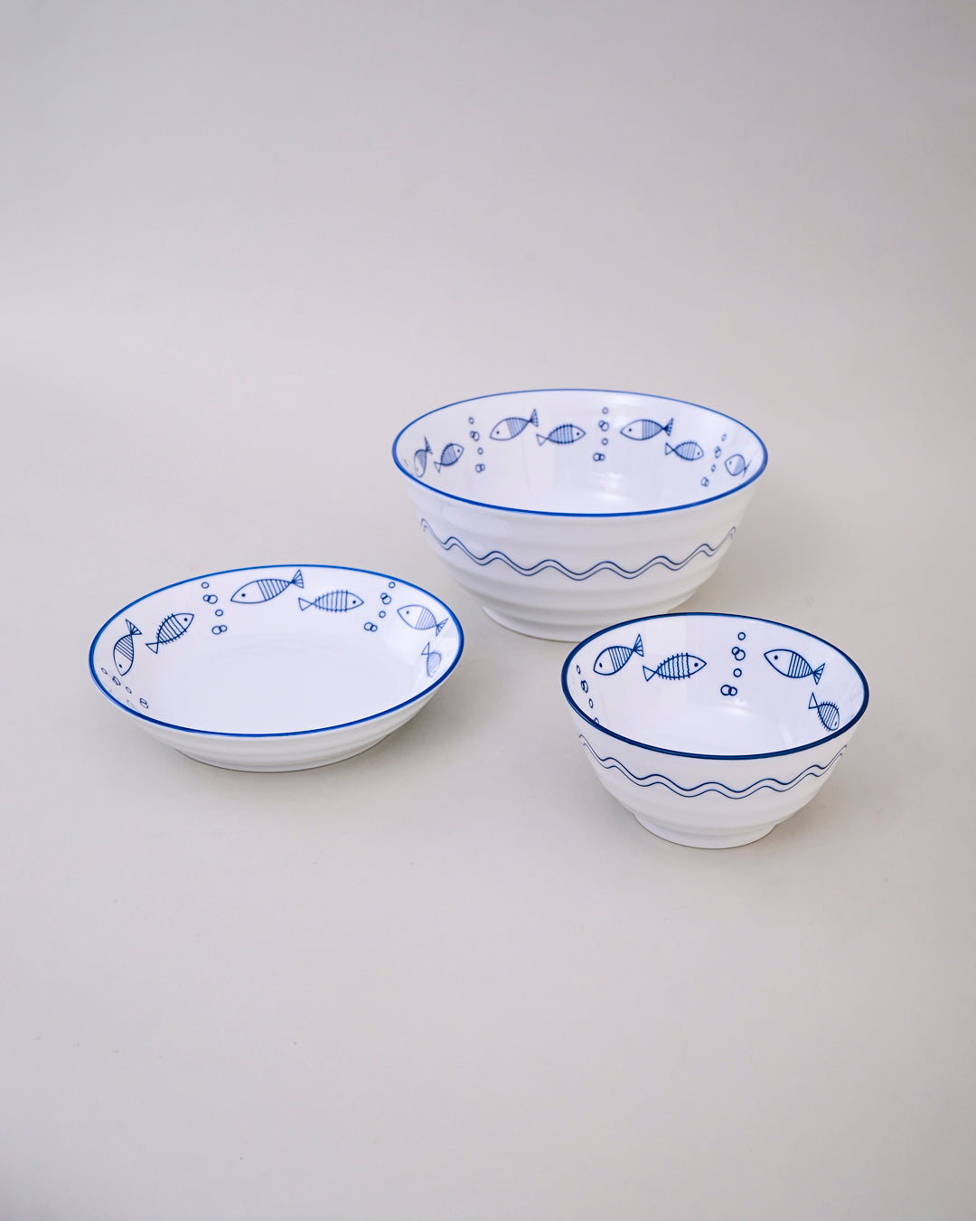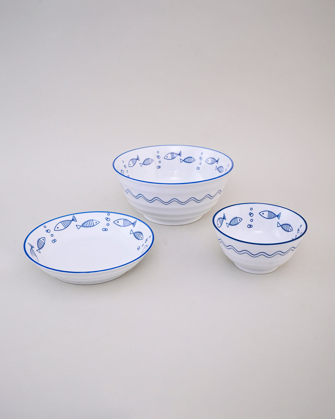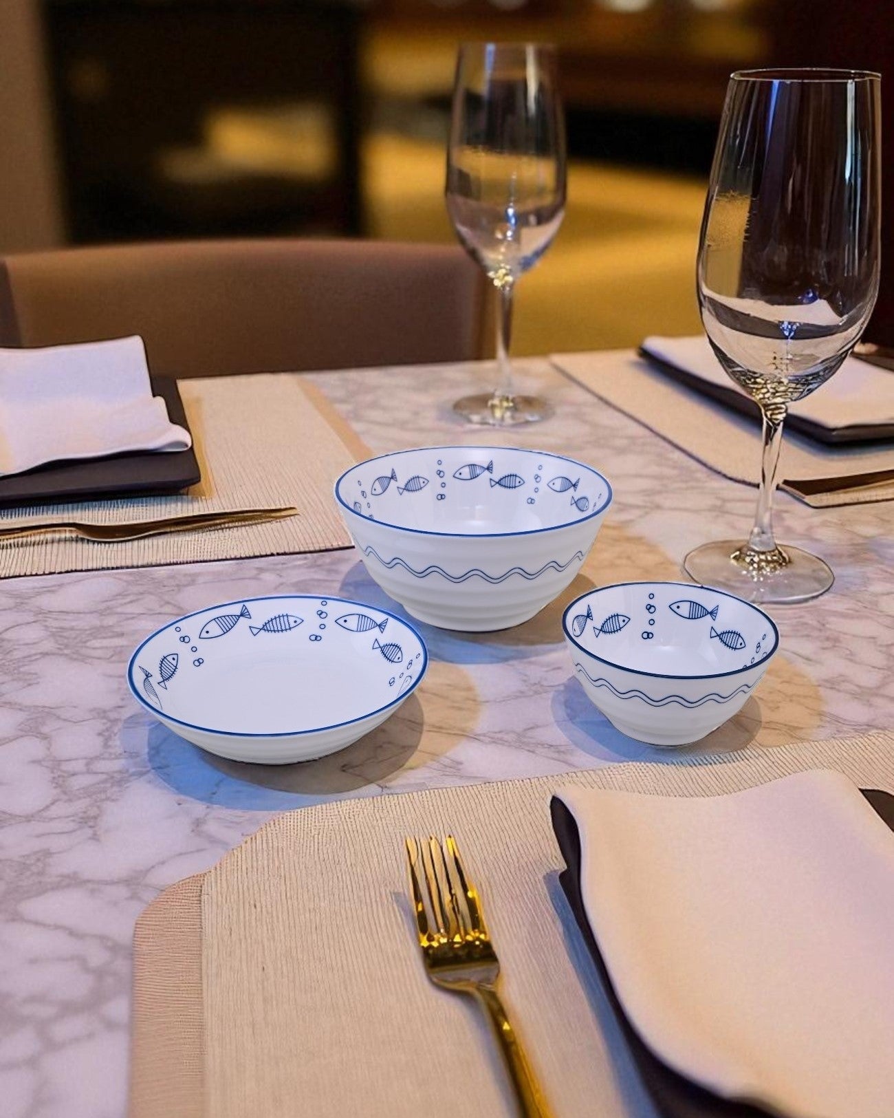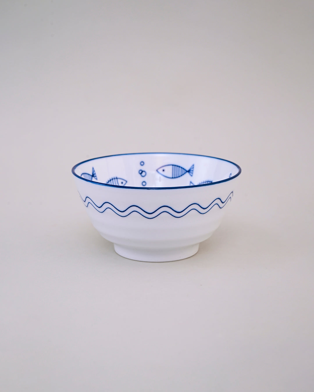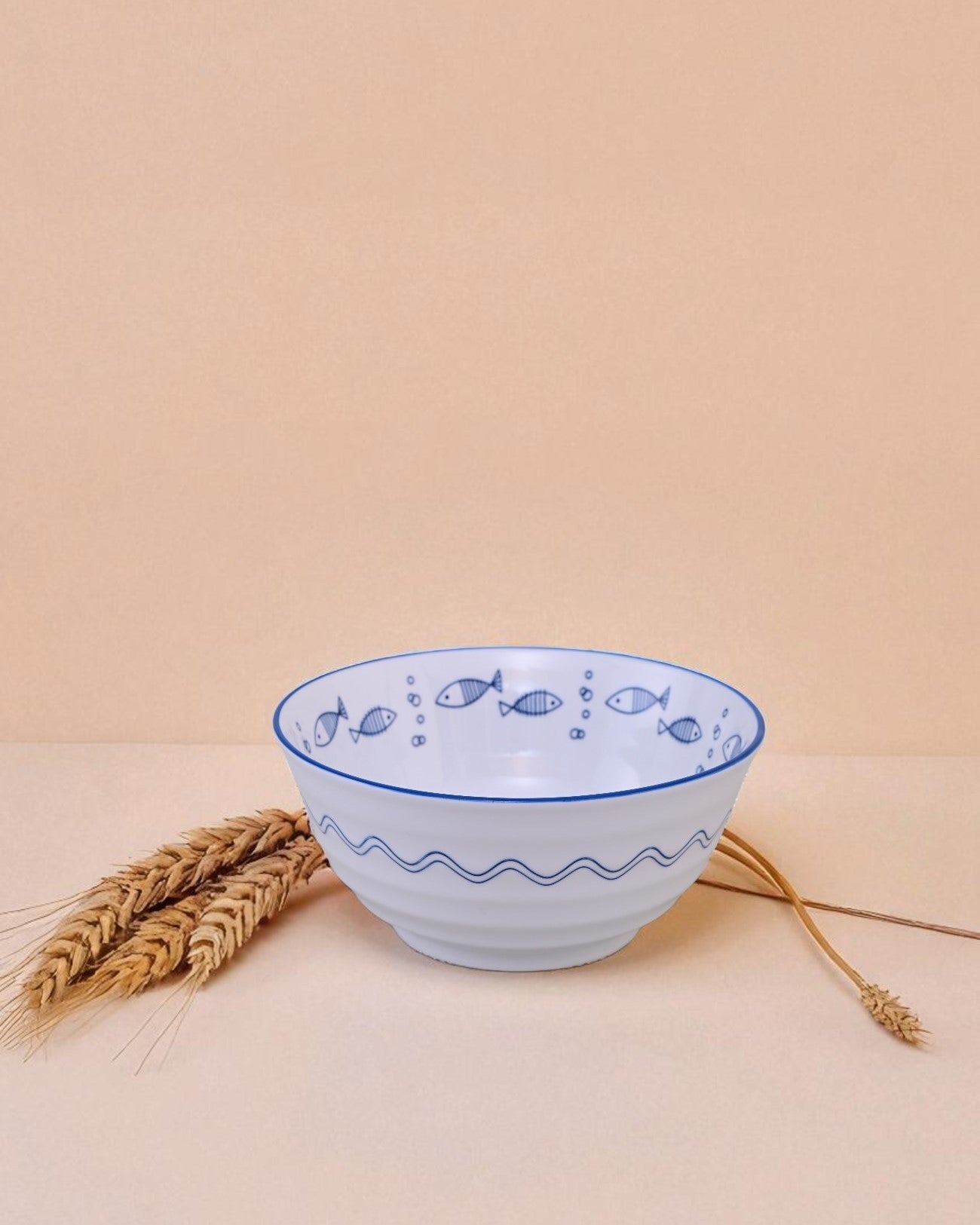 This charming ceramic bowl features a playful blue fish motif with delicate wave patterns, bringing a fresh ocean-inspired touch to your dining table. Its smooth finish and sturdy design make it perfect for serving snacks, soups, desserts, or even as a decorative piece. Lightweight yet durable, this bowl adds a coastal elegance to everyday meals and special gatherings alike.