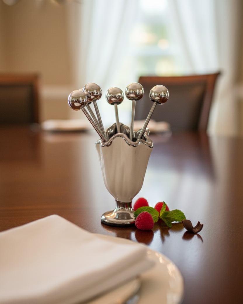 Add a touch of elegance to your table with this stylish Pick Holder Set. Designed with a pearl-finish cup and shiny metallic picks, it’s perfect for serving snacks, fruits, cheese cubes, or appetizers with ease. The compact holder keeps the picks neatly organized, while the ball-top skewers ensure a comfortable grip for guests.