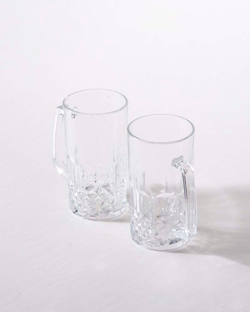 These beer mugs have a classic design, featuring a sturdy, large handle for easy grip and a thick base for stability. They are made of clear glass with a faceted body, which adds a bit of elegance and makes them easy to hold. These mugs are ideal for serving beer or other beverages and would be well-suited for use at home or in a pub setting