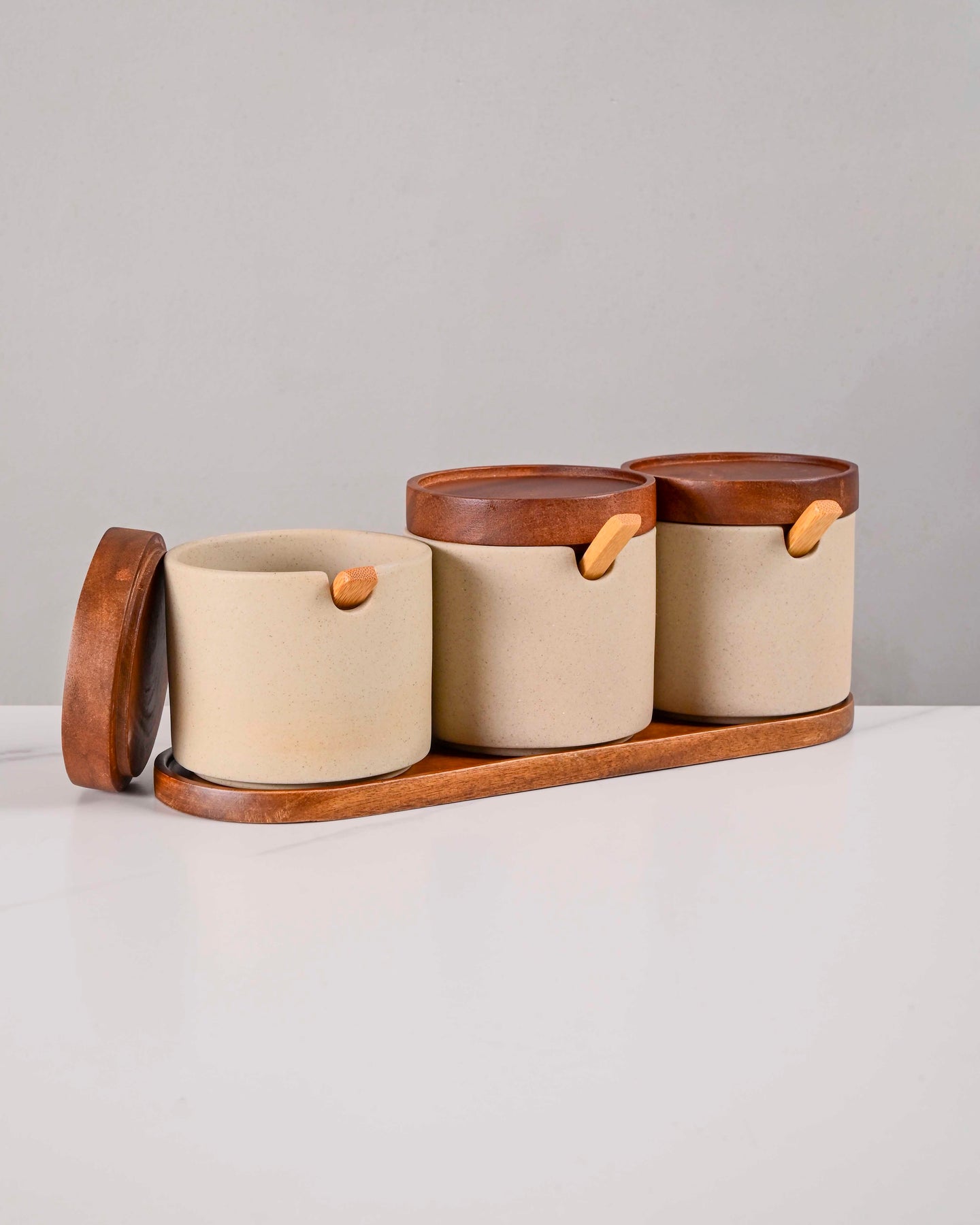 This stylish spice jar set includes 3 beige ceramic containers with smooth matte finish, each topped with a snug-fitting wooden lid featuring a slot for small spoons. The set rests on a matching wooden tray, making it perfect for organizing spices, condiments, or tea essentials while adding a touch of rustic elegance to your kitchen or dining space.