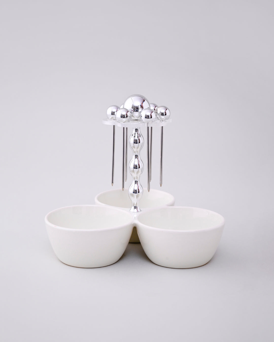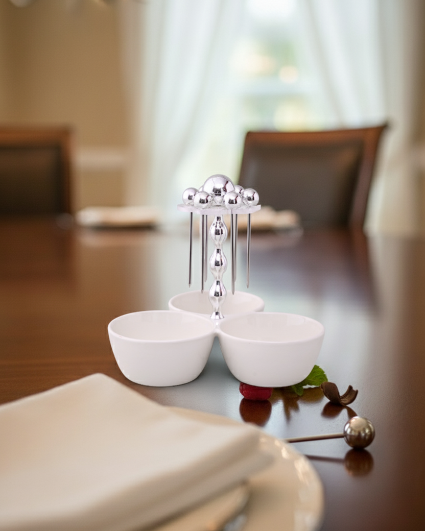Serve your dips, sauces, and snacks in style with this elegant Trio Condiment Server. Designed with three sleek ceramic bowls, it provides the perfect way to present chutneys, dips, dry fruits, or small appetizers. The center features a modern metallic pick holder with decorative skewers, making it easy for guests to serve themselves with convenience and hygiene.