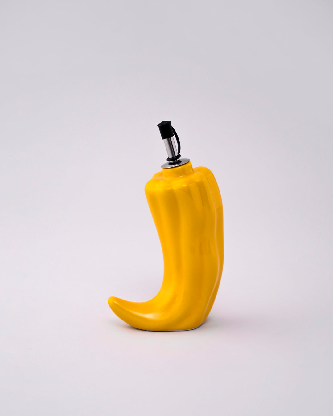 A stylish and quirky oil dispenser shaped like a vibrant yellow chili pepper. Made from durable ceramic, it adds a fun pop of color to your kitchen while serving practicality with its stainless-steel spout and secure cap. Perfect for dispensing olive oil, vinegar, or other liquid condiments with ease, this dispenser combines functionality with a playful design that enhances modern kitchen dΓ©cor.