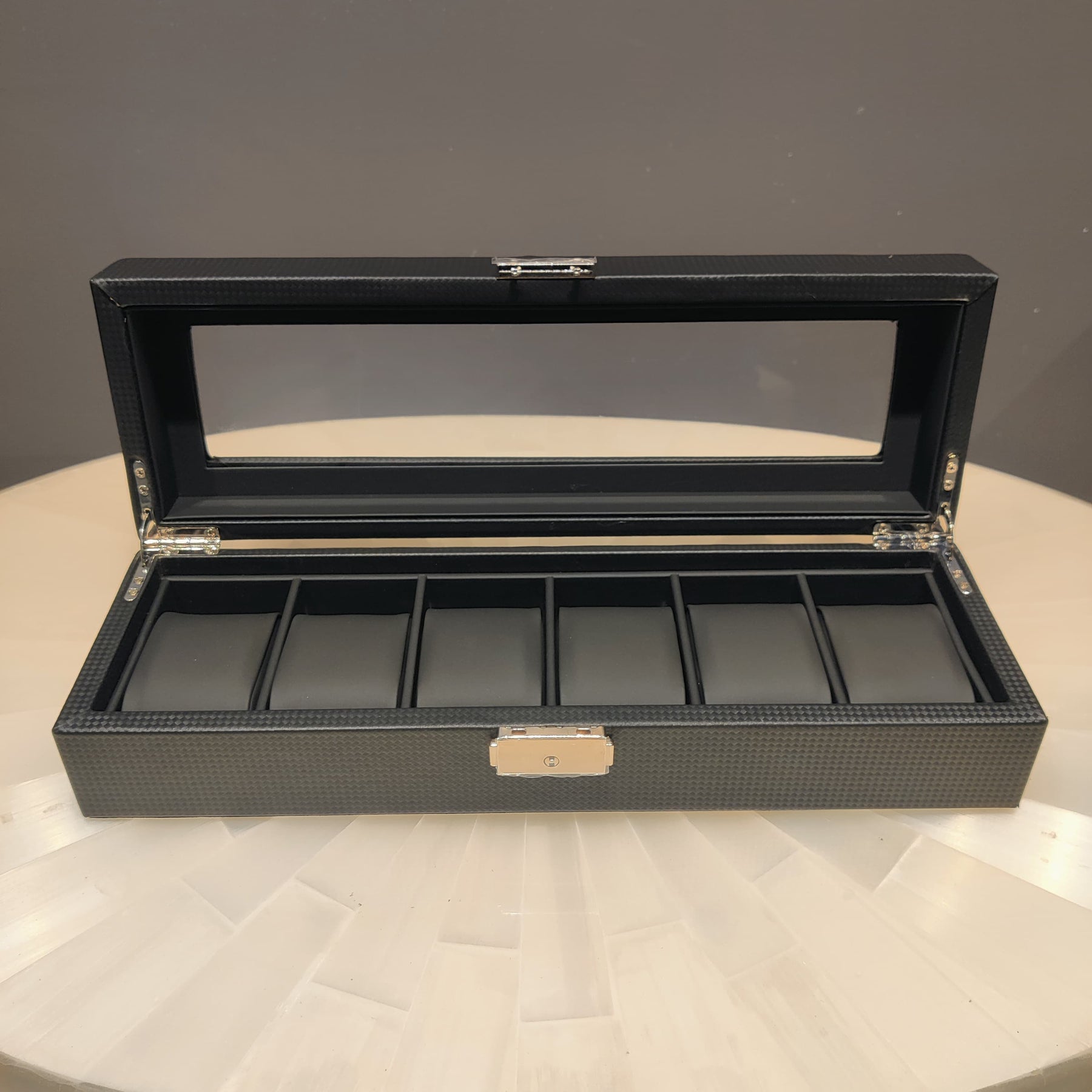 A perfect blend of simplicity and sophistication, this 6-slot watch organizer is designed for those who appreciate timeless elegance. The clear glass lid provides a sleek display while keeping your watches protected from dust and scratches. Crafted in black with a refined finish, this organizer seamlessly fits into any modern or classic setting.