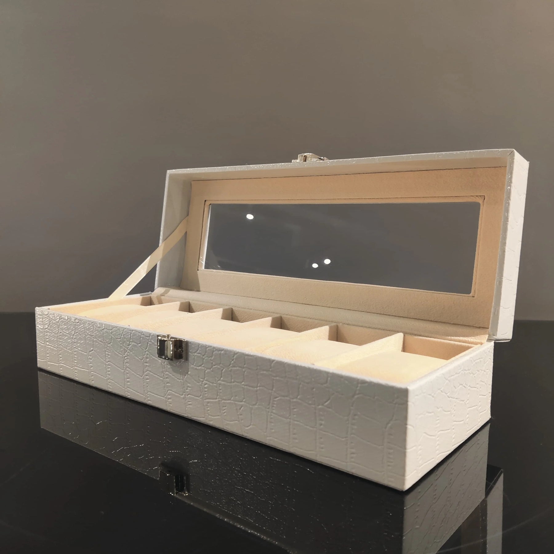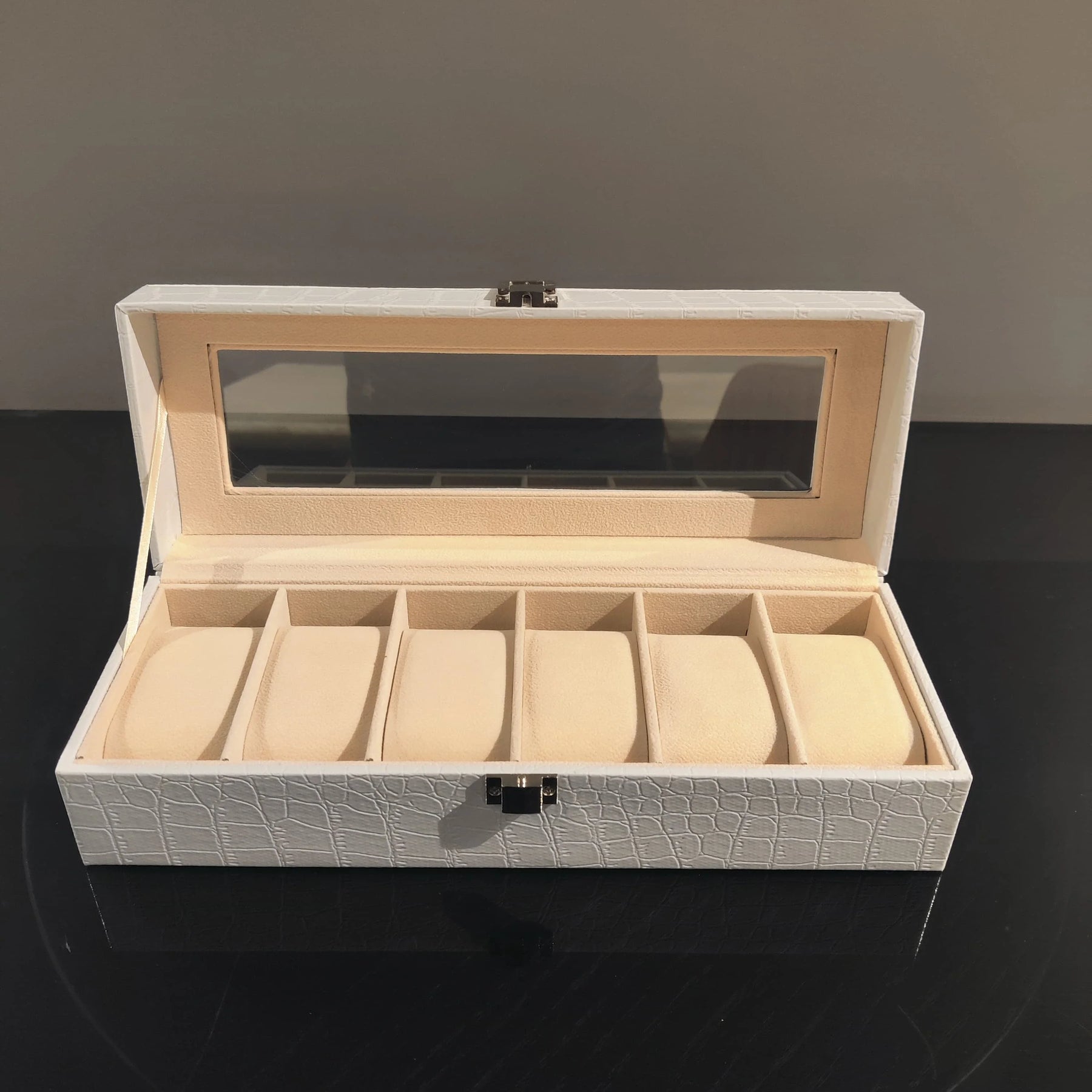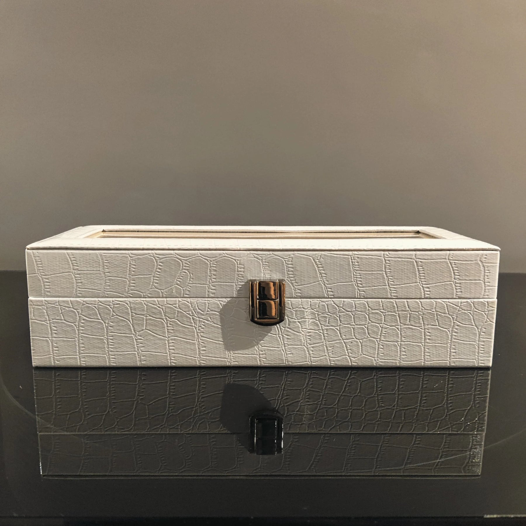 Elevate your watch collection with this sophisticated 6-slot watch organizer, crafted for those who appreciate style and functionality. The glass-top lid offers a refined display, allowing you to admire your timepieces while keeping them protected. Wrapped in a faux alligator leather finish, this case exudes understated elegance, making it a statement piece for any dresser or office.