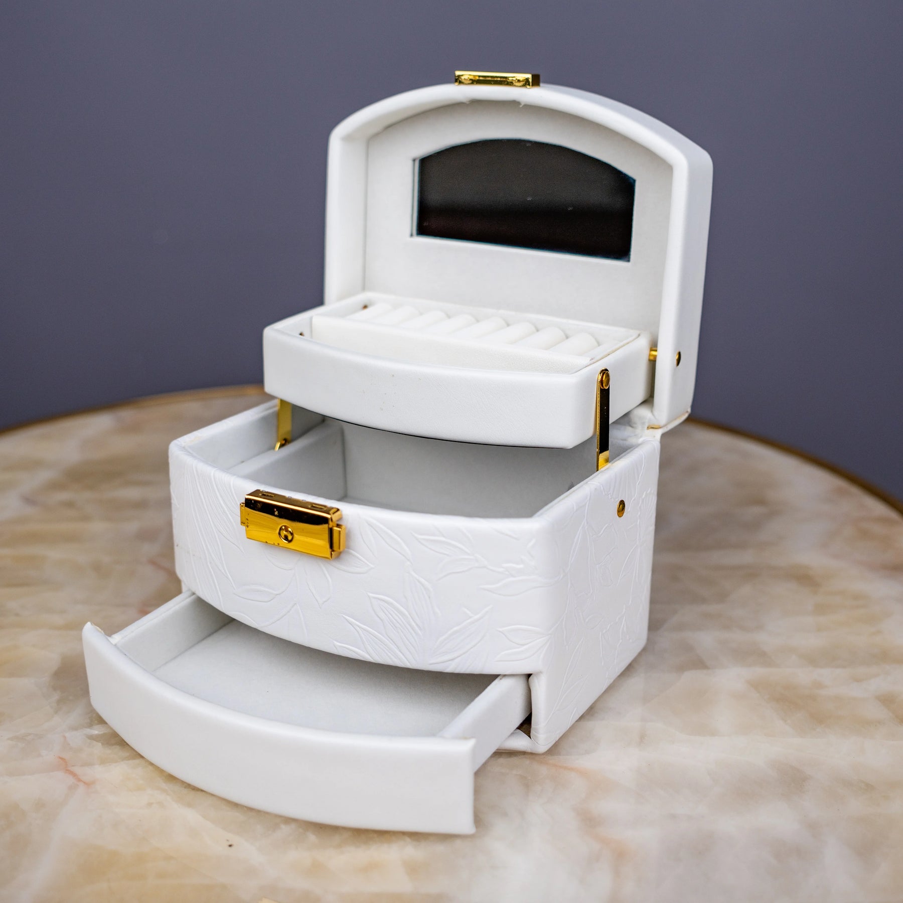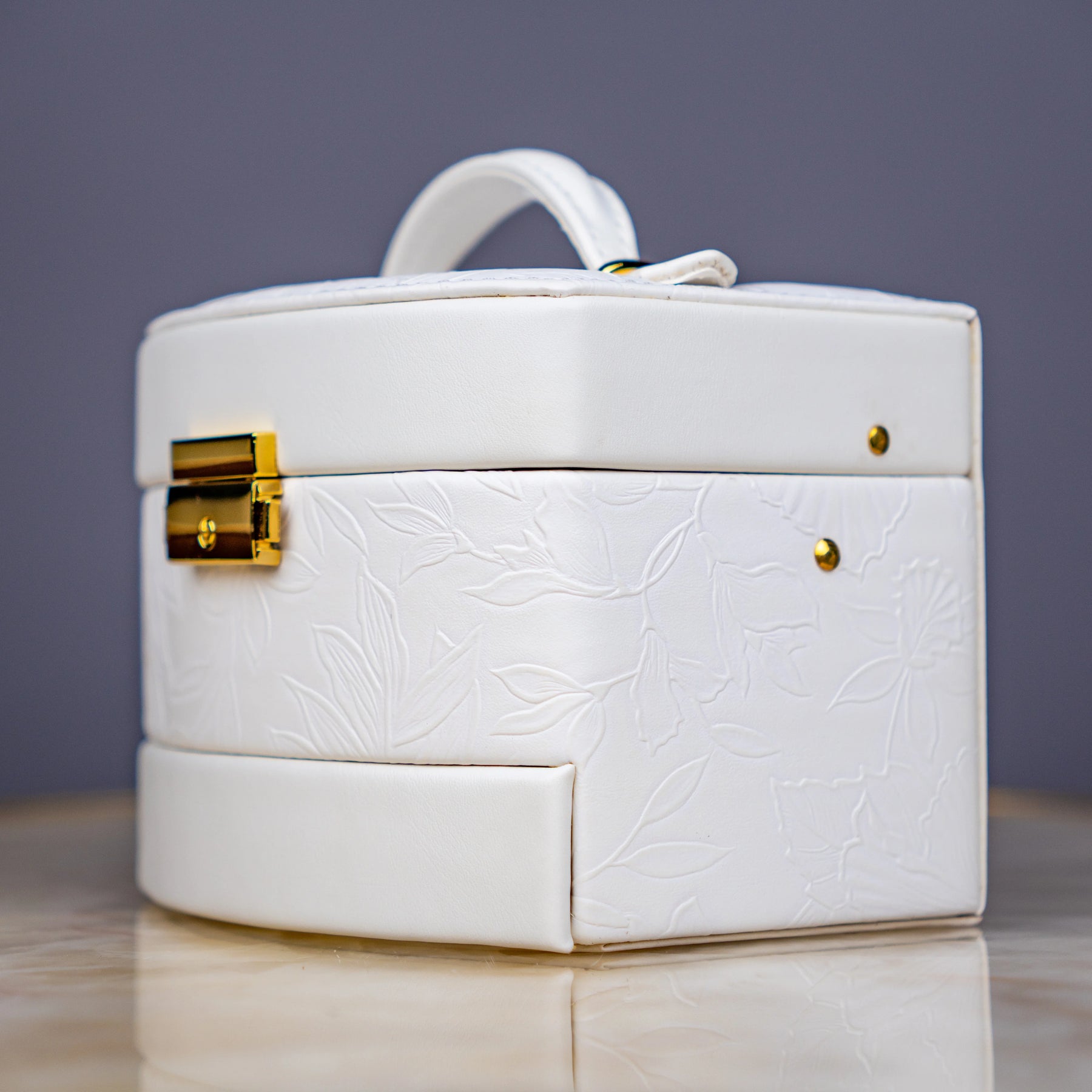Add timeless elegance to your vanity with this exquisite white jewelry box, adorned with a delicate floral embossed exterior and finished with gold-toned hardware. Inside, soft velvet lining cradles your treasures, while the lift-out tray, spacious compartments, and pull-out drawer make organizing effortless. A built-in mirror adds convenience, making it perfect for everyday use or travel.