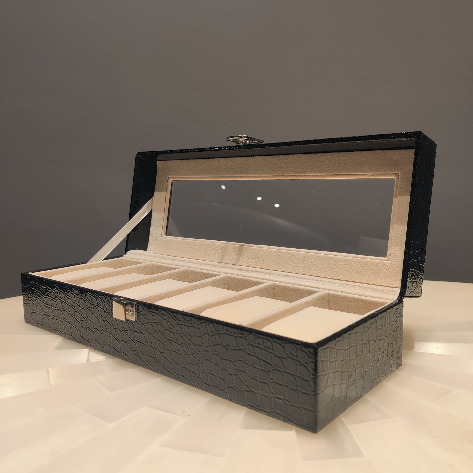 Elevate your watch collection with this sophisticated 6-slot watch organizer, crafted for those who appreciate style and functionality. The glass-top lid offers a refined display, allowing you to admire your timepieces while keeping them protected. Wrapped in a faux alligator leather finish, this case exudes understated elegance, making it a statement piece for any dresser or office.
