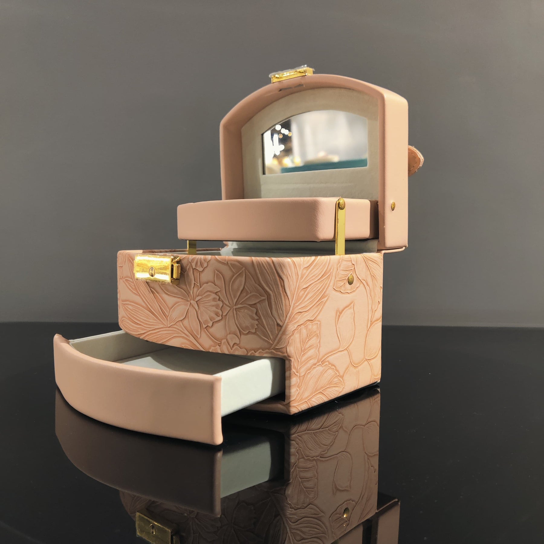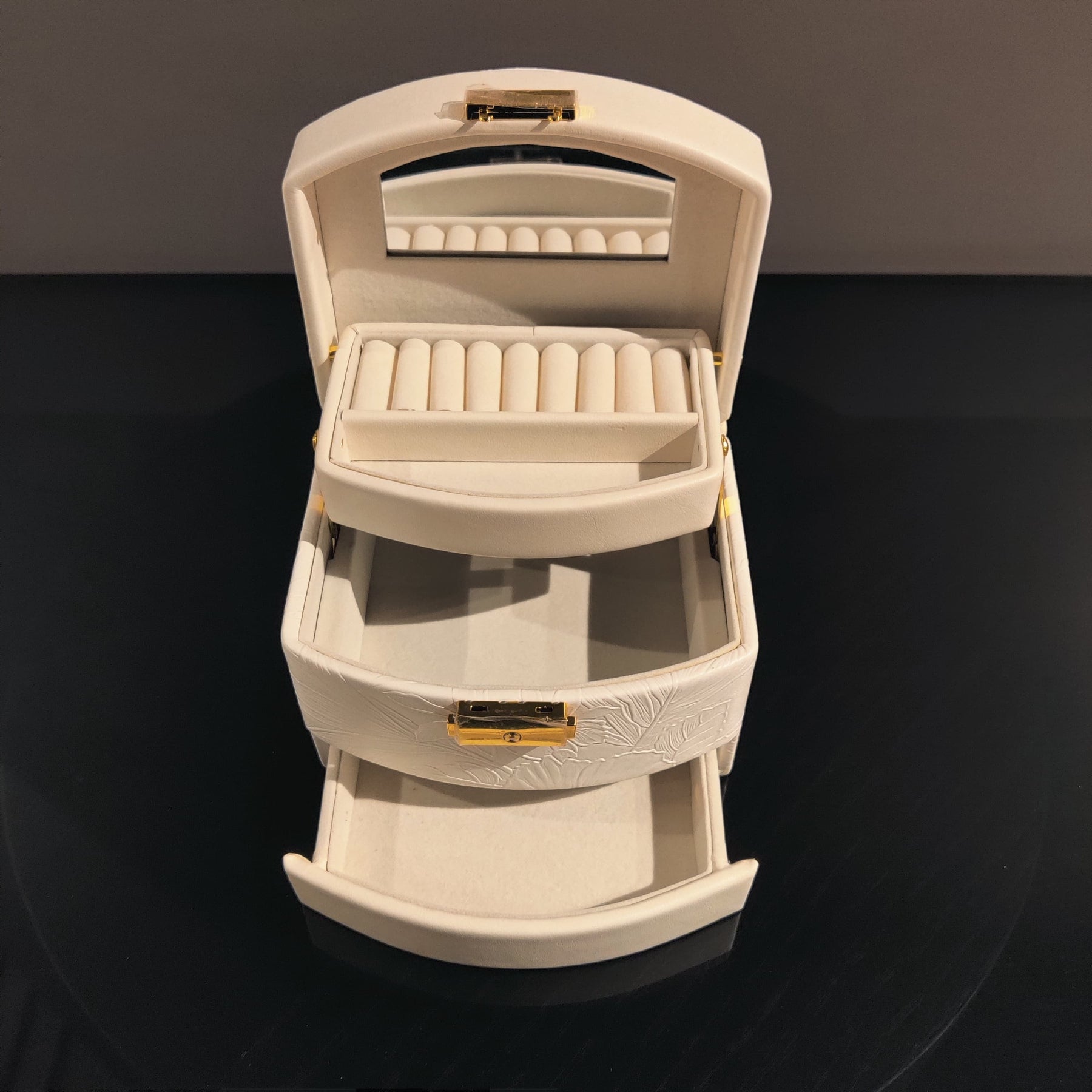 Keep your treasures beautifully stored with this luxurious 3-tier jewelry organizer, designed for elegance and efficiency. With a smooth hinge mechanism, it gracefully unfolds to reveal multiple compartments, each tailored to hold your rings, earrings, necklaces, and bracelets without tangling or damage.