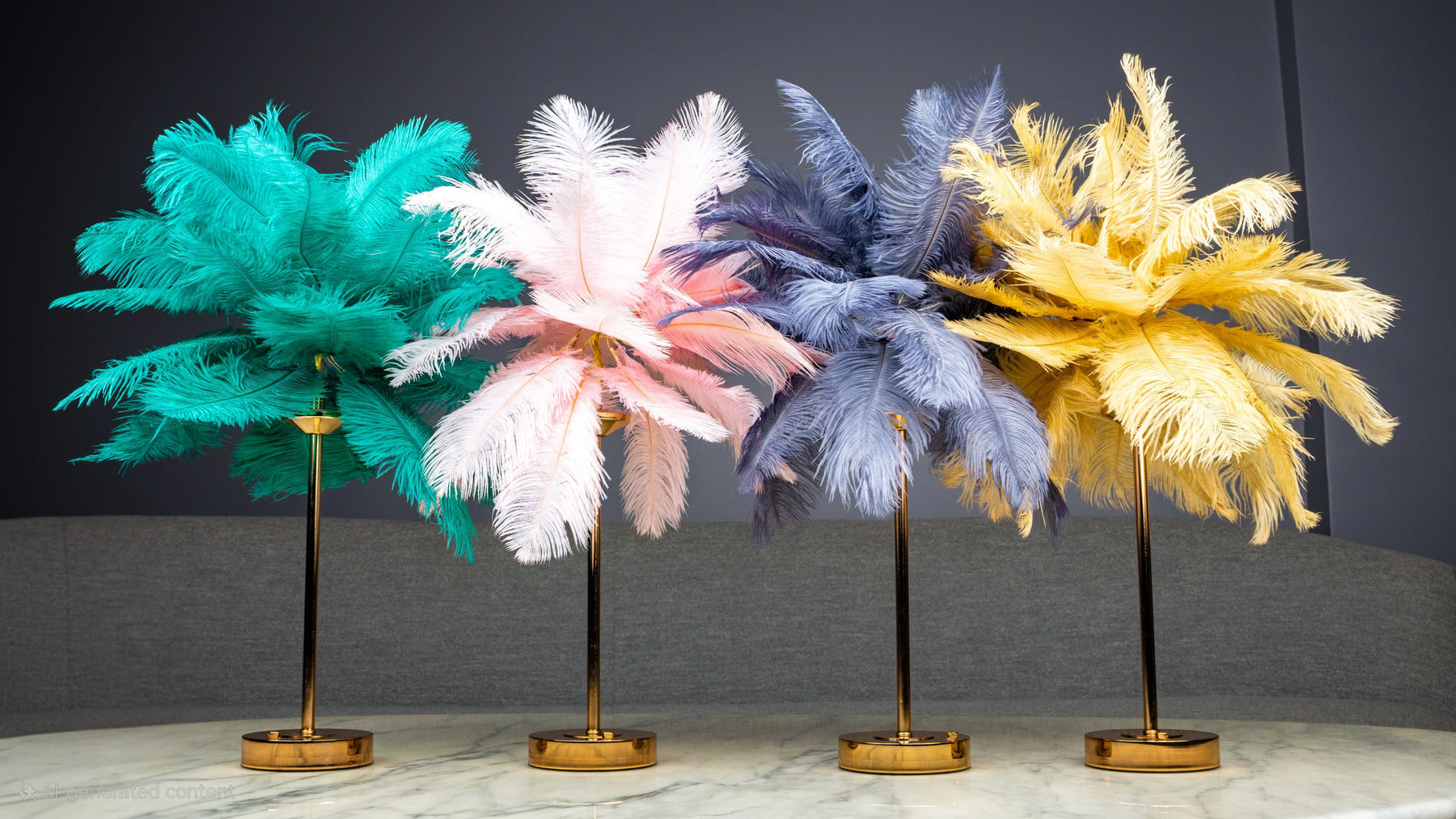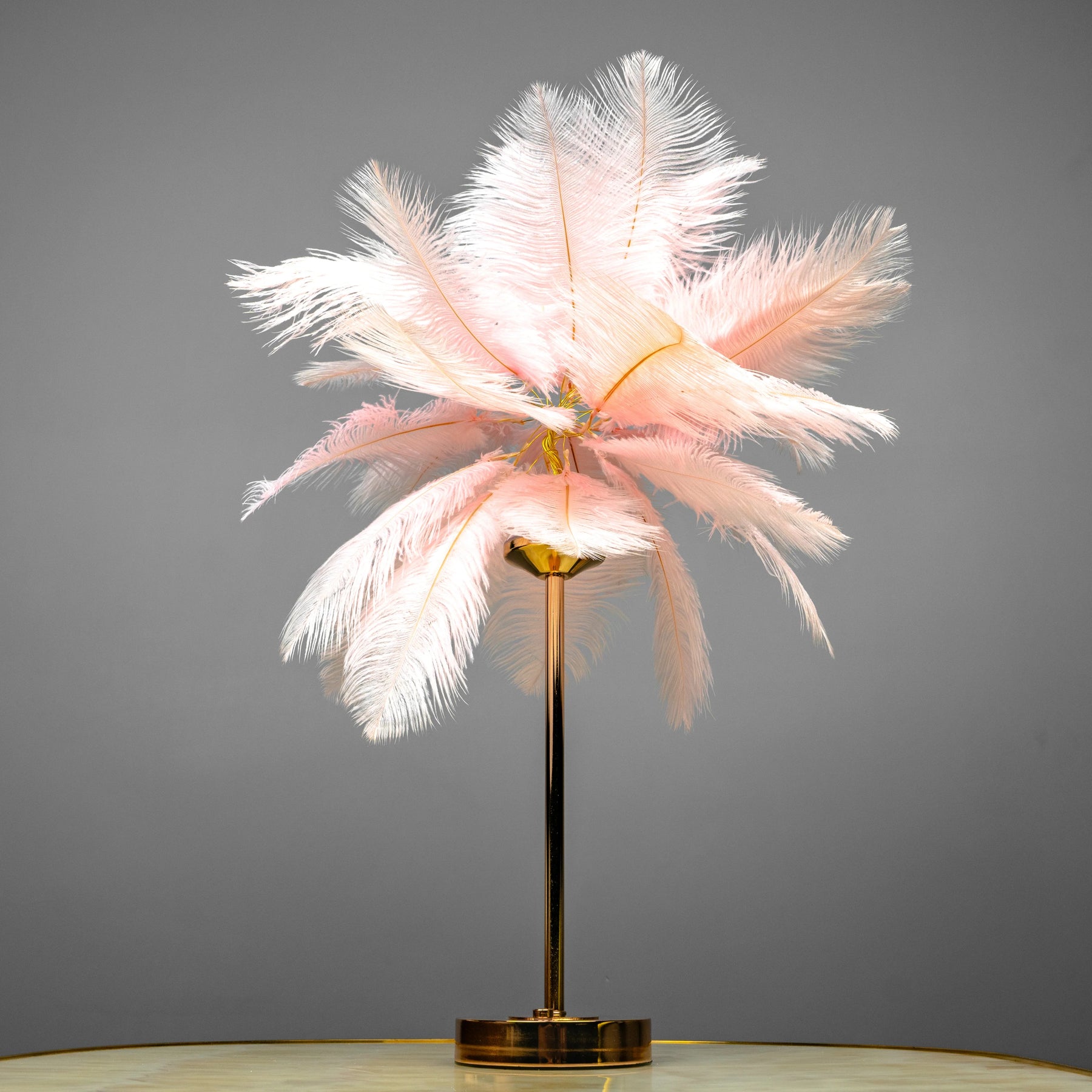 Add a soft, whimsical charm to your interiors with the Feather Glow Lamp - Pink. This unique decor piece features lush pastel pink ostrich-style feathers fanning out elegantly atop a sleek golden stem. Radiating glamour and femininity, it works beautifully as a bedside accent, vanity table centerpiece, or event decor element for luxe occasions.