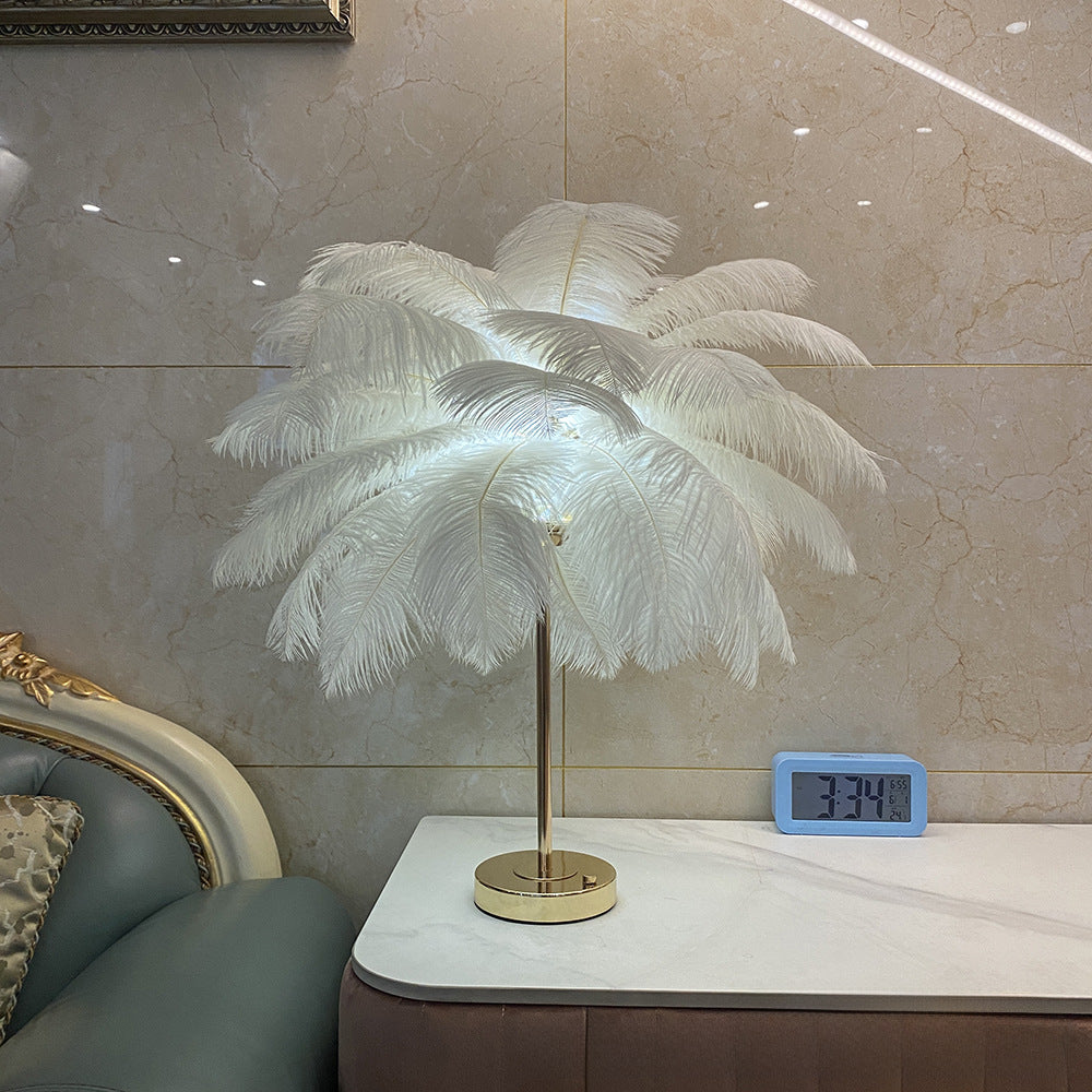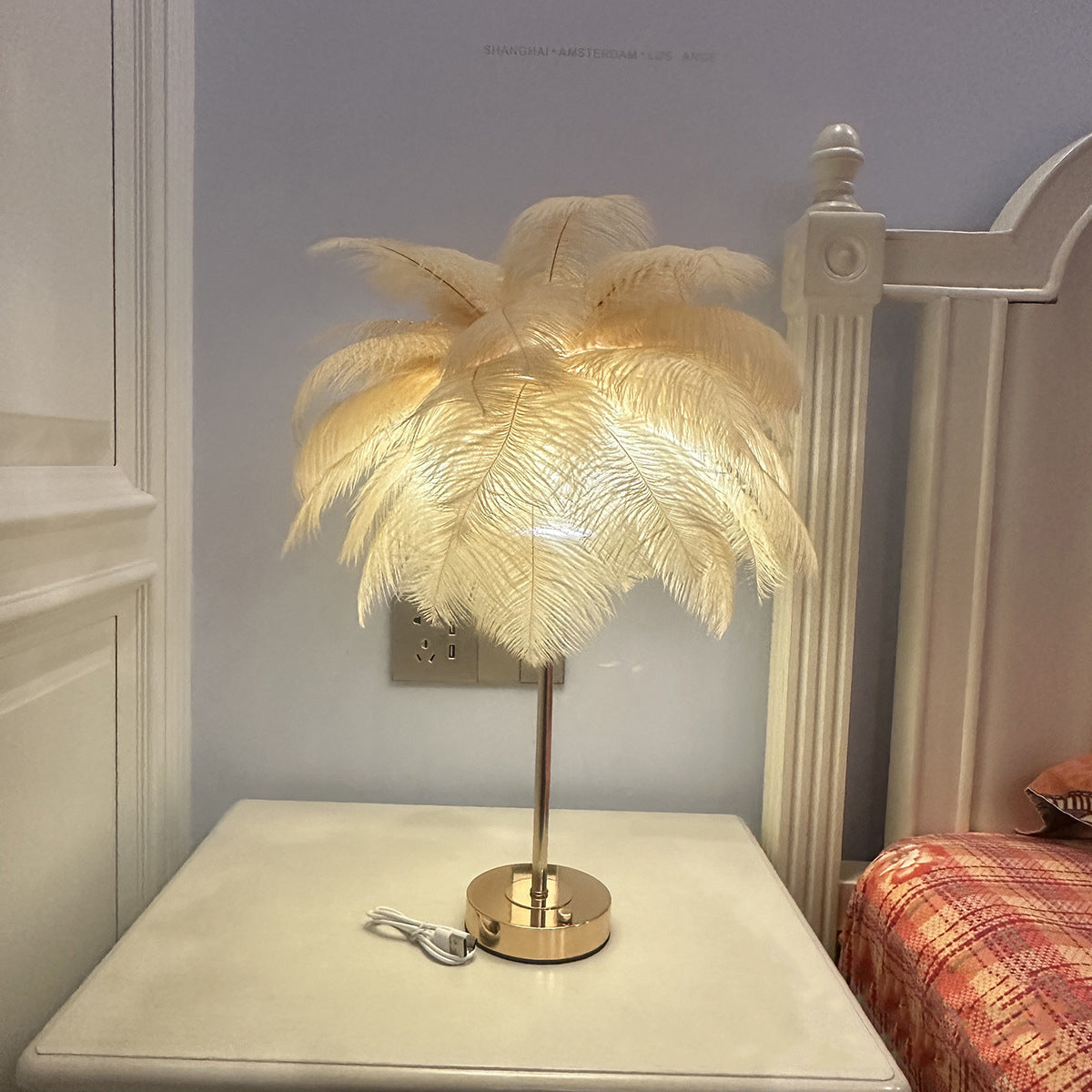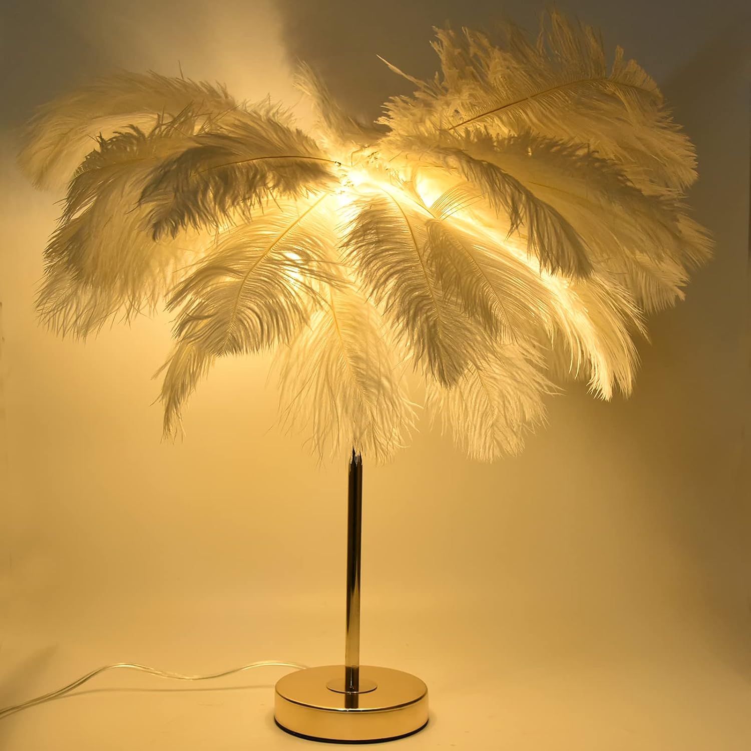 Its luxurious design combines natural textures with a sleek golden stand, making it a perfect fit for glamorous interiors, modern aesthetics, or art deco-inspired spaces. The soft, diffused glow emanating from within the layers of feathers sets the perfect mood for intimate evenings, lively gatherings, or serene moments of relaxation.