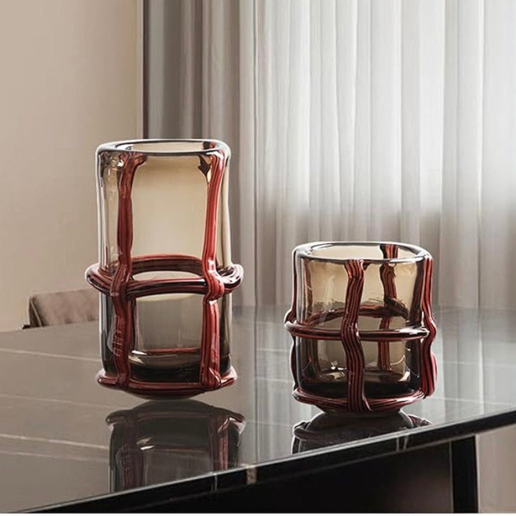 Enhance your decor with the Amber Ribbed Glass Vase Set, a bold and sophisticated piece that seamlessly blends luxury and artistry. Crafted from premium handcrafted glass, this vase features a stunning bronze base adorned with vivid red stripes, creating a dynamic yet elegant focal point for any room.