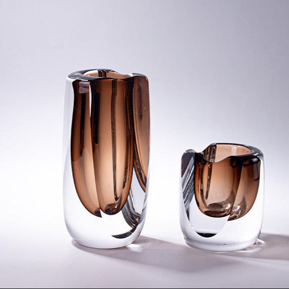 Elevate your decor with the timeless beauty of the Bronze Elegance Glass Vase. Handcrafted with care, this exquisite vase features a sleek clear brown/bronze hue, blending modern sophistication with artisanal charm. Its minimalist design and reflective surface make it a stunning addition to any space, whether used for floral arrangements or displayed as a standalone piece.