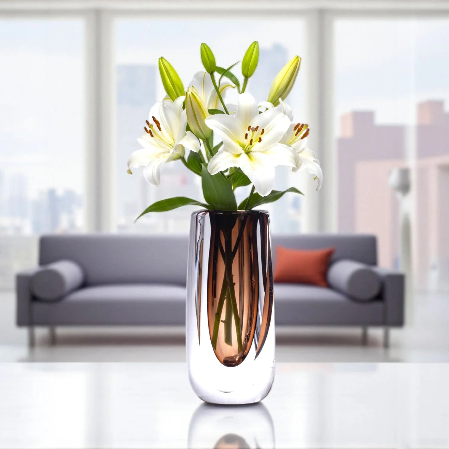 Perfect for coffee tables, dining spaces, or shelves, the Bronze Elegance Glass Vase effortlessly complements a variety of interiors, from modern to classic. Its handcrafted quality and luxurious finish make it a true work of art.