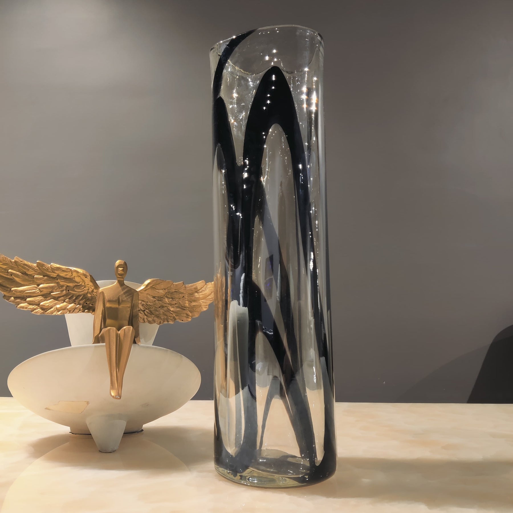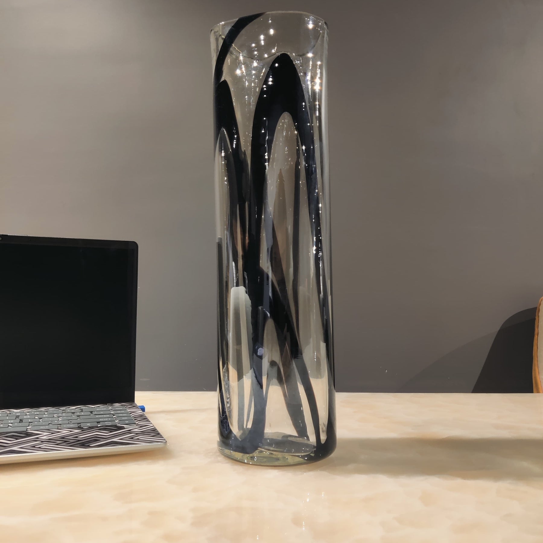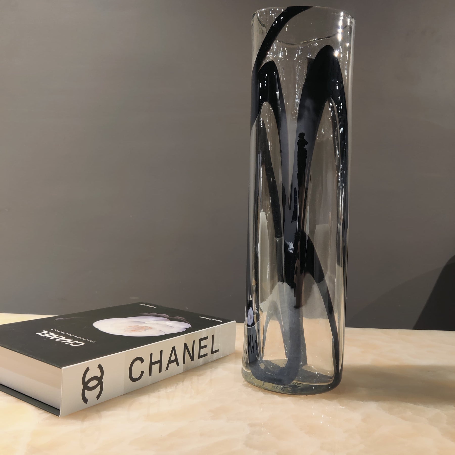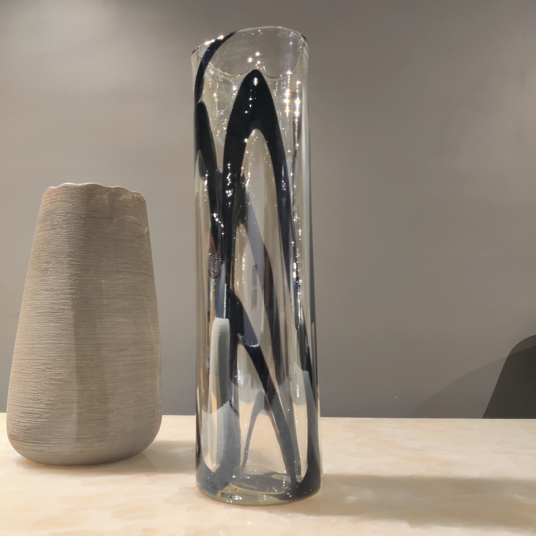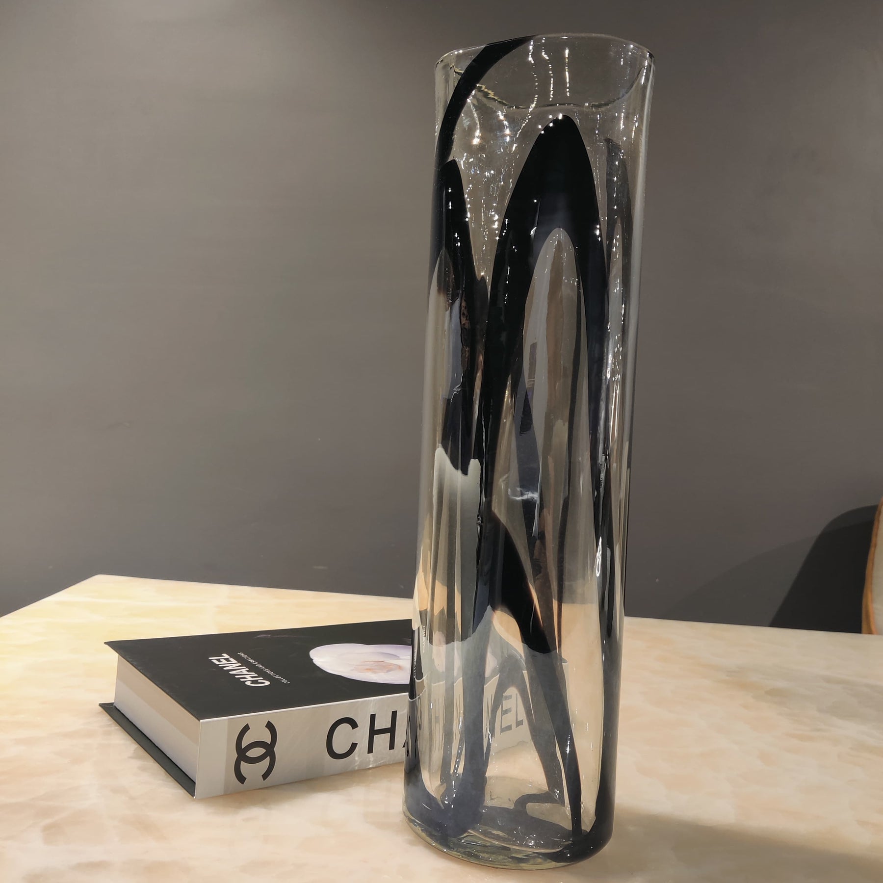 Standing 40.5 cm tall, this vase is perfect for dining table centerpieces, console table accents, luxury office spaces, or stylish shelf displays. Its elongated silhouette and sophisticated dark swirls make it a versatile decor piece, whether used to hold long-stemmed florals, dried branches, or displayed as a sculptural work of art. The Nocturne Swirl Handblown Glass Vase effortlessly blends into minimalist, contemporary, and eclectic home settings, elevating any room with depth, movement, and artistic refinement.