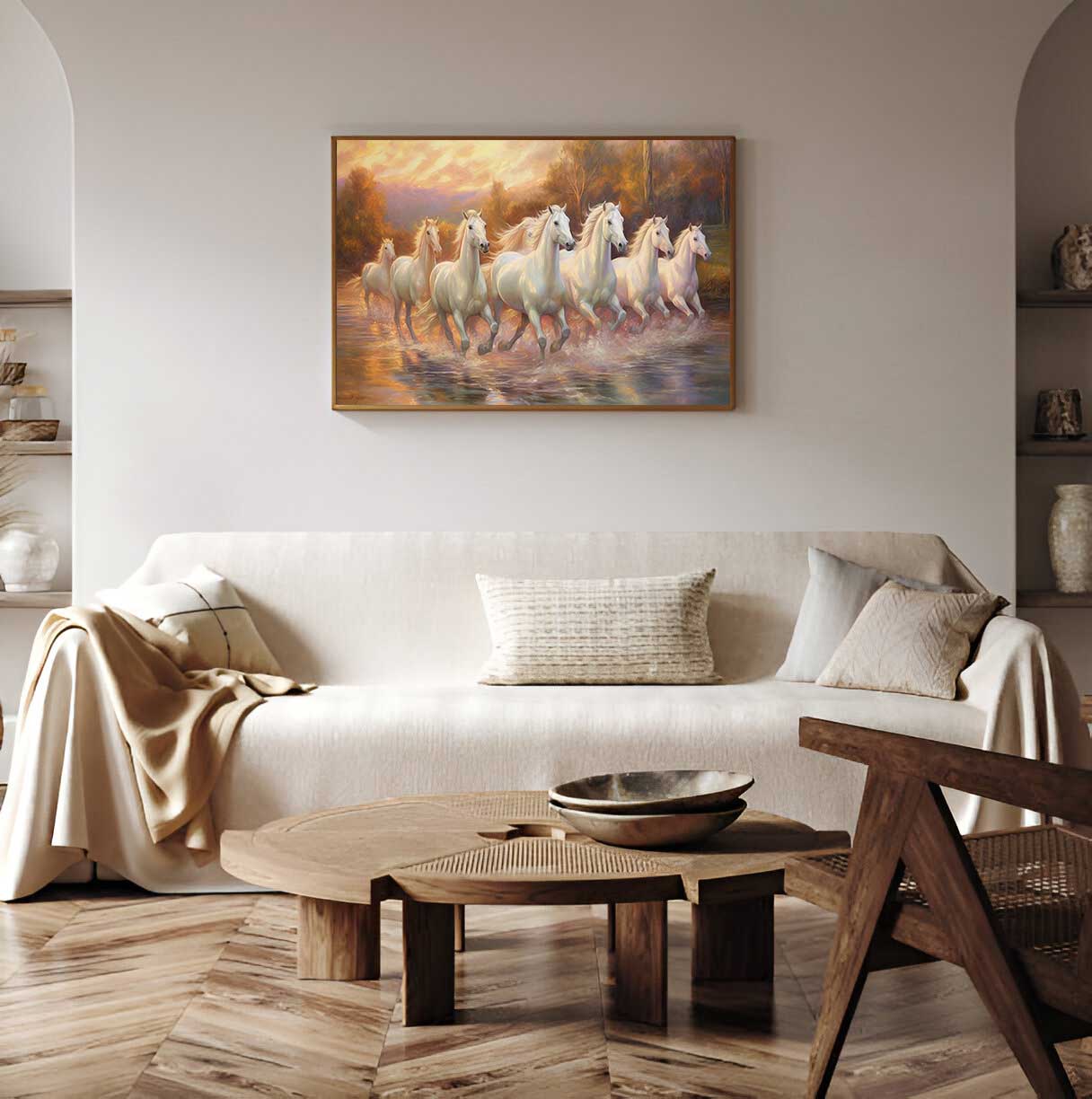 Elevate the energy of your home or workspace with this beautifully crafted 7 Running Horses Painting, inspired by the principles of Vastu Shastra. Known for symbolizing success, speed, and positive momentum, this artwork is more than just decor—it's a powerful tool to attract prosperity and growth.