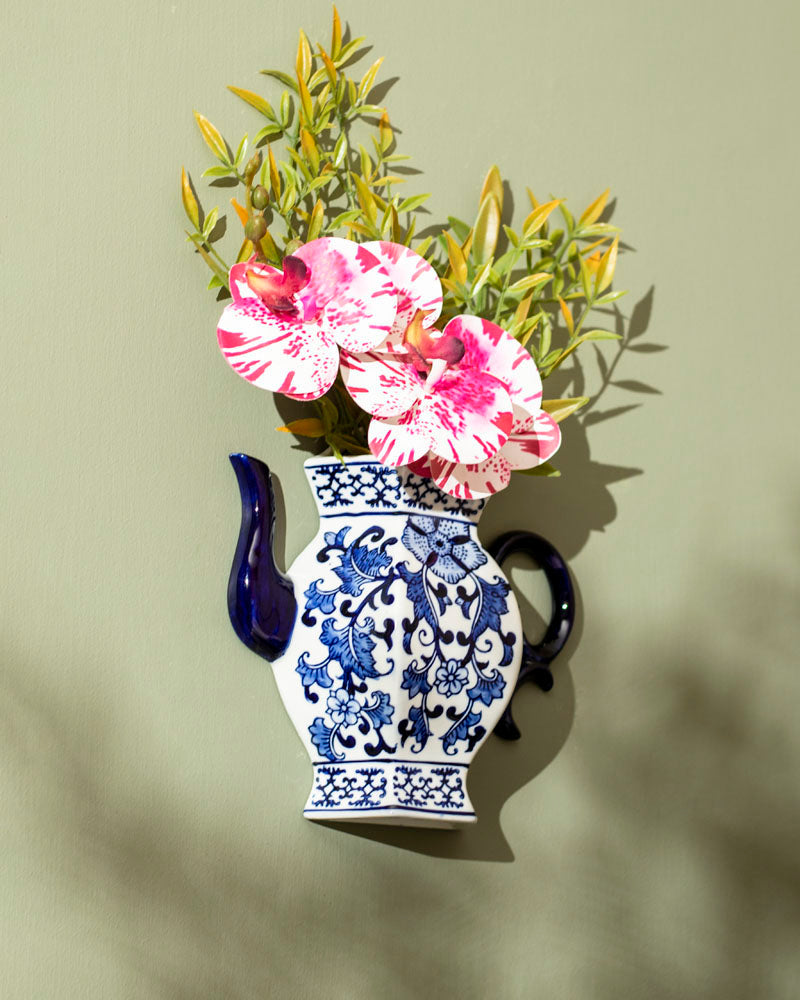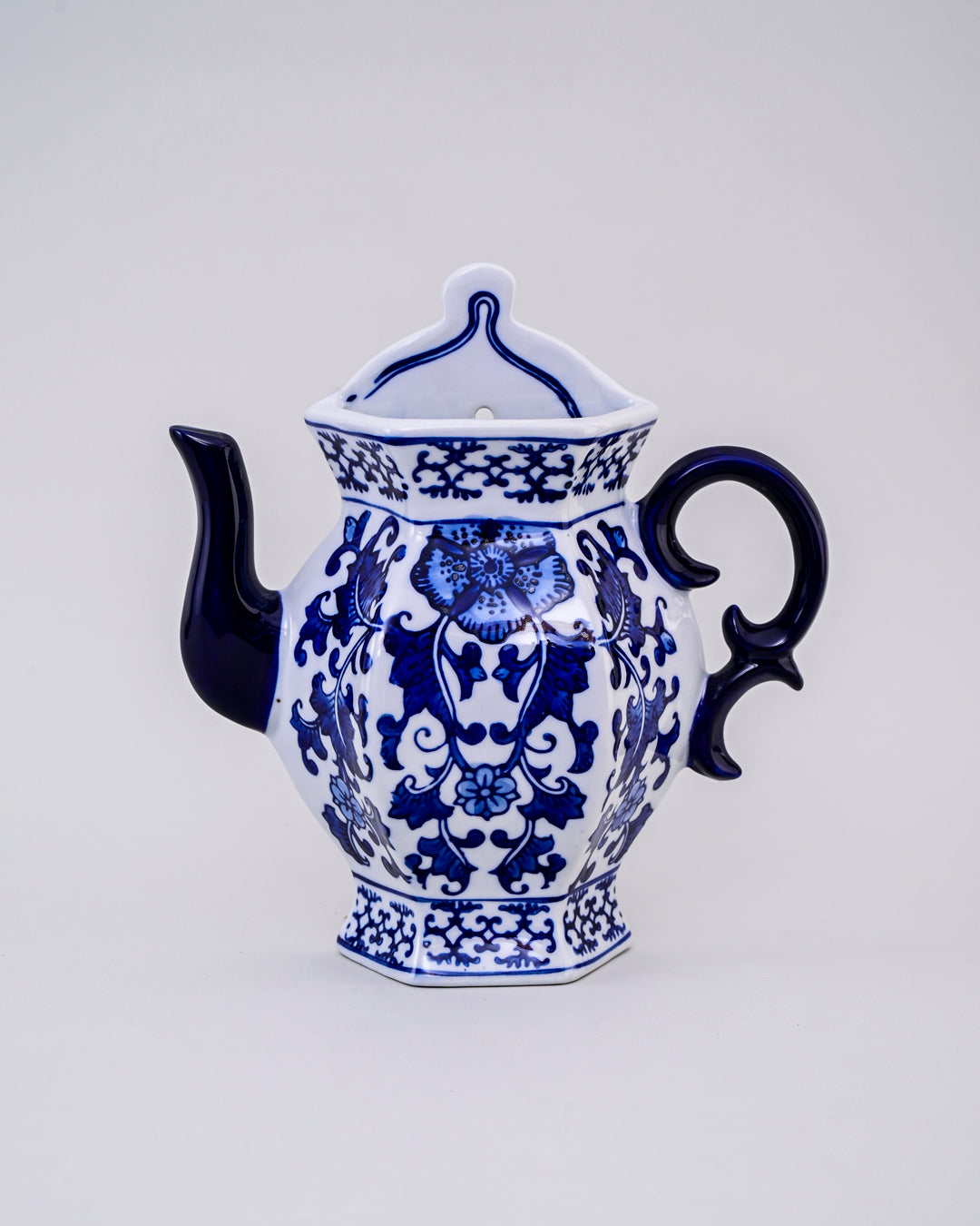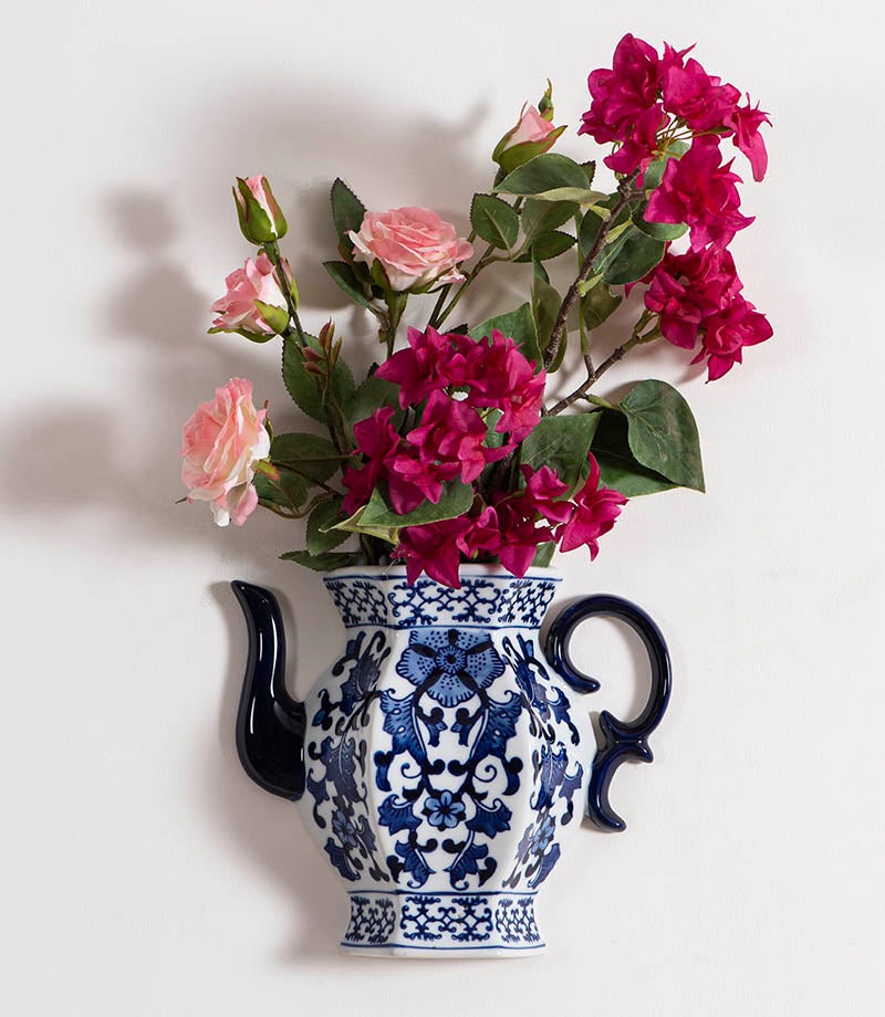 Painted in a traditional blue and white palette, this wall mounted kettle comes with a flat back and creates visual drama for your walls. Use this as a standalone wall accent or place your favorite flowers to create your own unique wall accent.